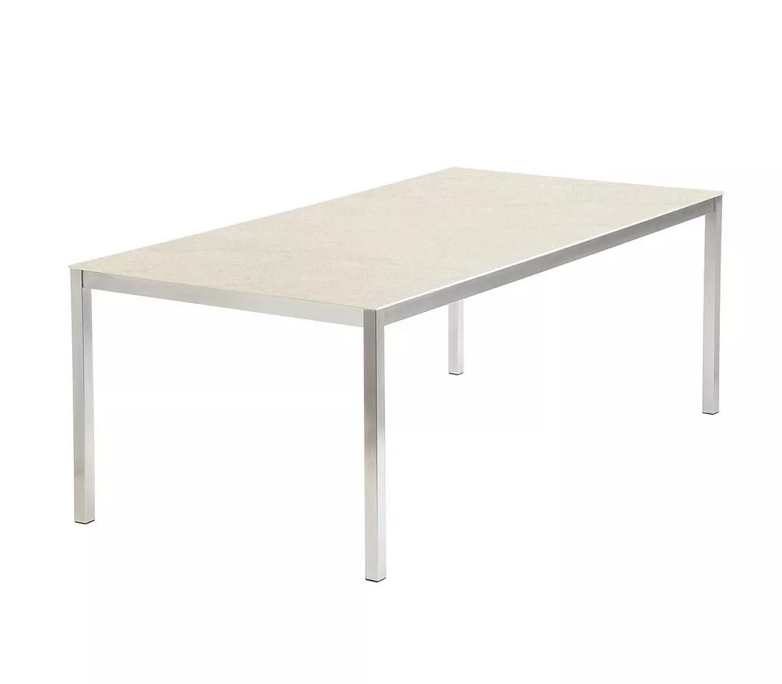 Rechteckiger Esstisch Equinox mit Tischplatte aus Keramik und Gestell aus Edelstahl pulverbeschichtet Graphite oder Arctic White. Barlow Tyrie verwendet allerbesten Edelstahl, welcher korrosionsbeständig und leicht zu reinigen ist. Dieses Material ist auch geeignet für salzwassernahe Gebiete, Inseln etc.