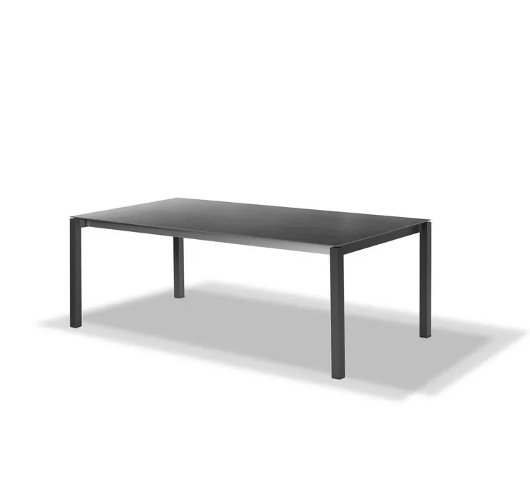 aus Aluminium, metallic-silber pulverbeschichtet oder mit Strukturlack anthrazit matt • Tischbeine quadratisch Das robuste Aluminiumgestell der Rio Tische in anthrazit oder metallic-silber ist eine perfekte Verbindung zu allen Stühlen aus dem gleichen Material. Die stabilen Tischbeine (50x50mm) in Verbindung mit dem solide verschweißten Rahmen tragen auf elegante Weise die unterschiedlichen Tischplatten. Oberflächen aus fm-laminat spezial, fm-ceramtop oder Teak ermöglichen eine perfekte Kombination zu den Rio Sesseln, aber auch zu vielen anderen Sesseln unseres Sortiments. Schraubgleiter ermöglichen einen Höhenausgleich bei Bodenunebenheiten.Rio Outdoor Esstisch mit eingerückter Zarge