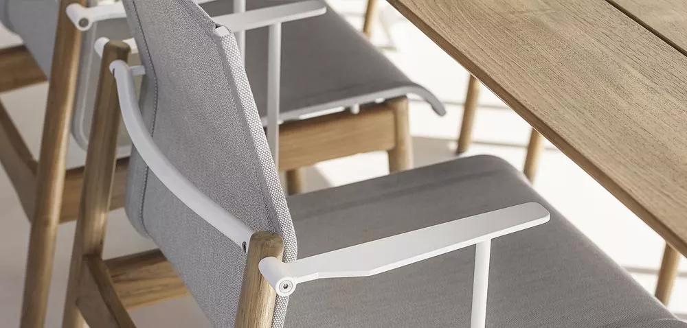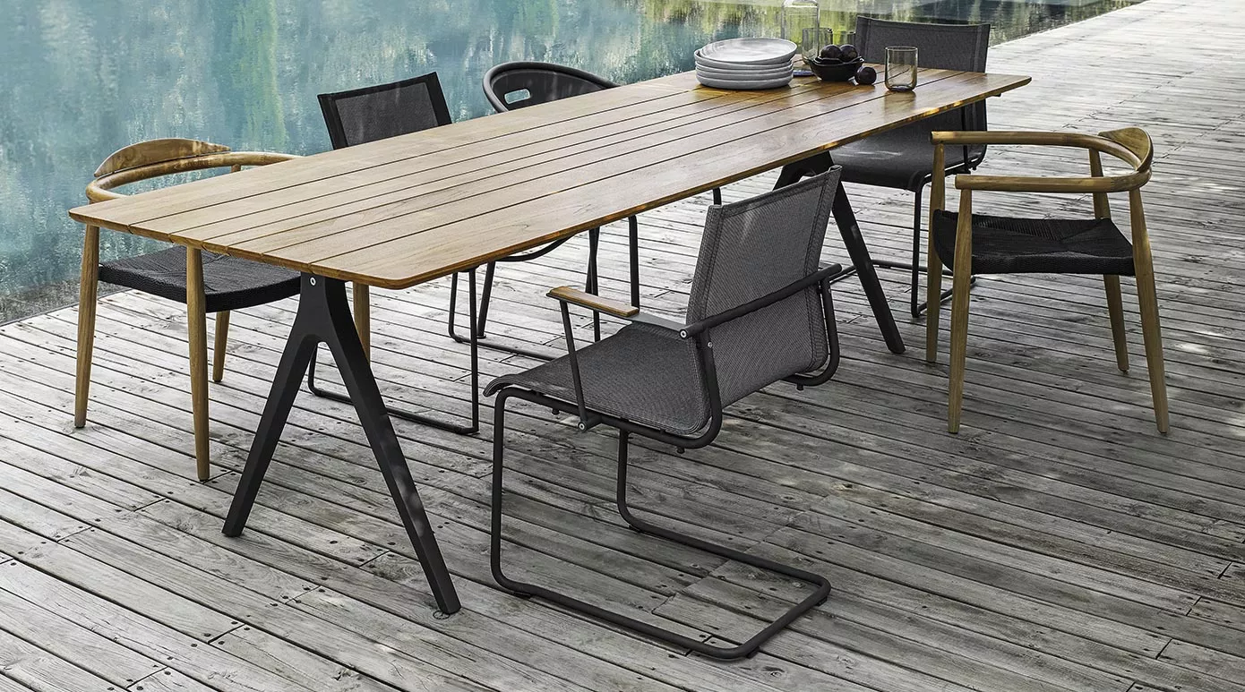 Die Split Esstische von Gloster setzen ein klares Statement: charakteristische, gegossene Aluminiumbeine in einer umgedrehten Y-Form wirken kraftvoll und gleichzeitig erstaunlich leicht. Ihre konische Silhouette schafft eine subtile Verbindung zum Boden und trägt wahlweise eine warme, lattenförmige Teak-Tischplatte oder eine elegante Keramikplatte – für zeitloses Outdoor-Dining mit architektonischer Präsenz.