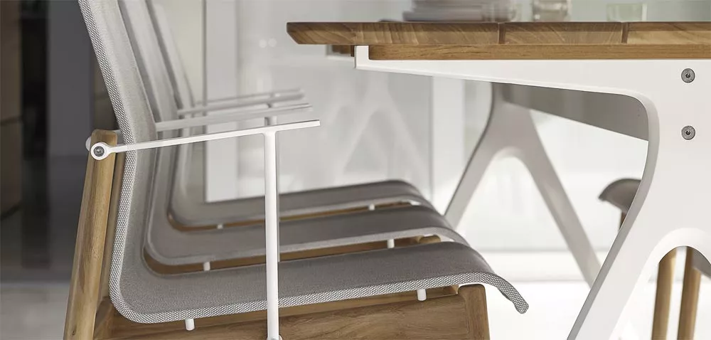 Der Rahmen ist pulverbeschichtet (u. a. in White oder Meteor), die Tischplatten sind je nach Ausführung als Natural Finish Teak-Lamellen erhältlich. Split wird ohne Schirmloch geliefert, eine passende Schutzhülle ist als Zubehör verfügbar; die Montage ist erforderlich.