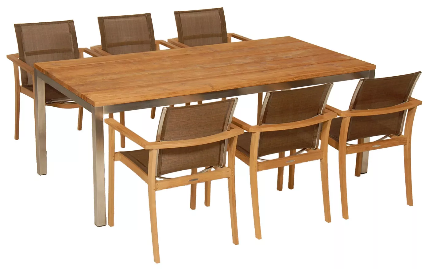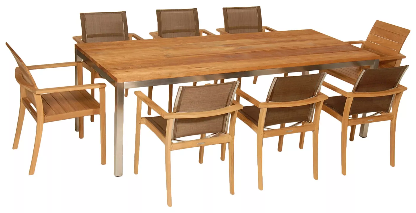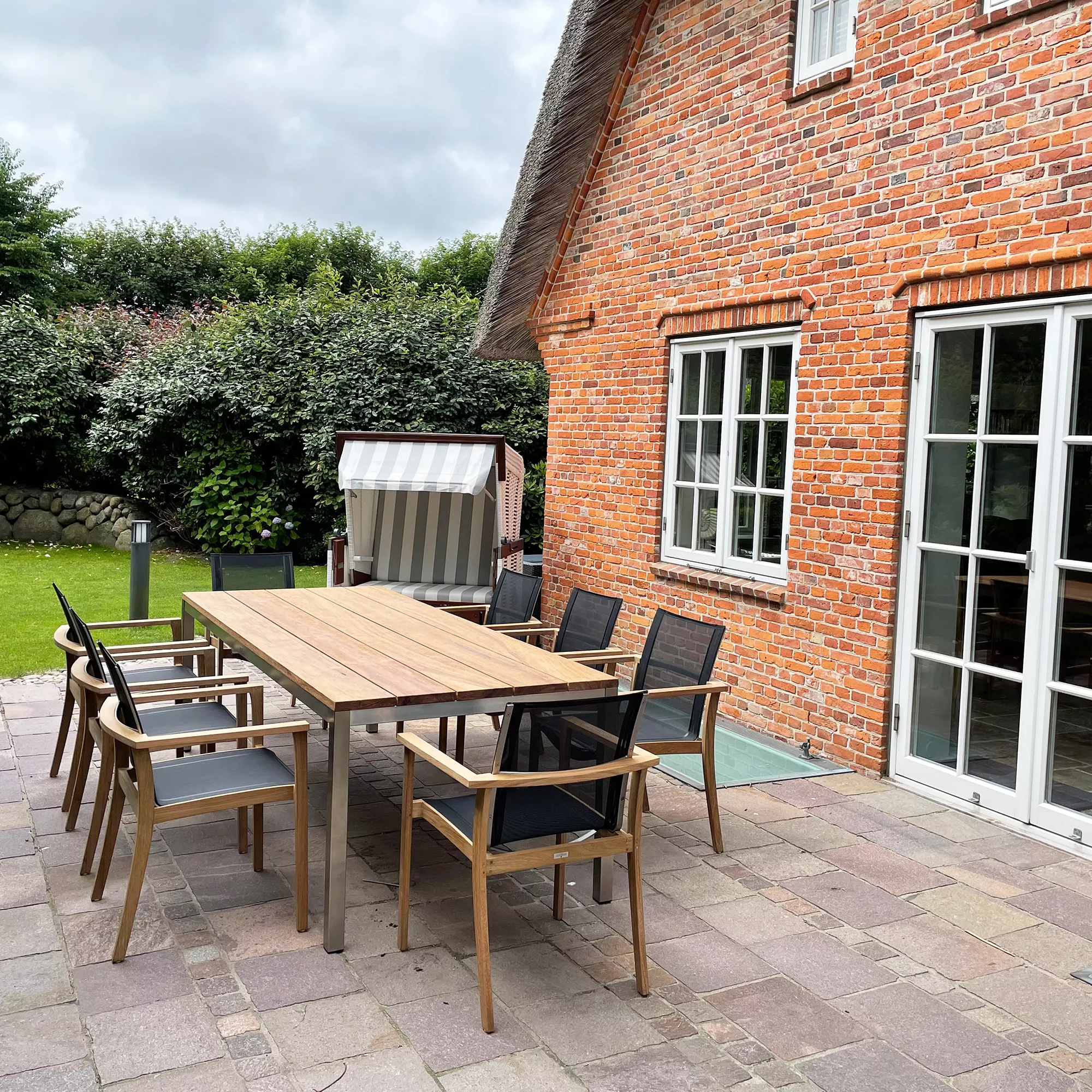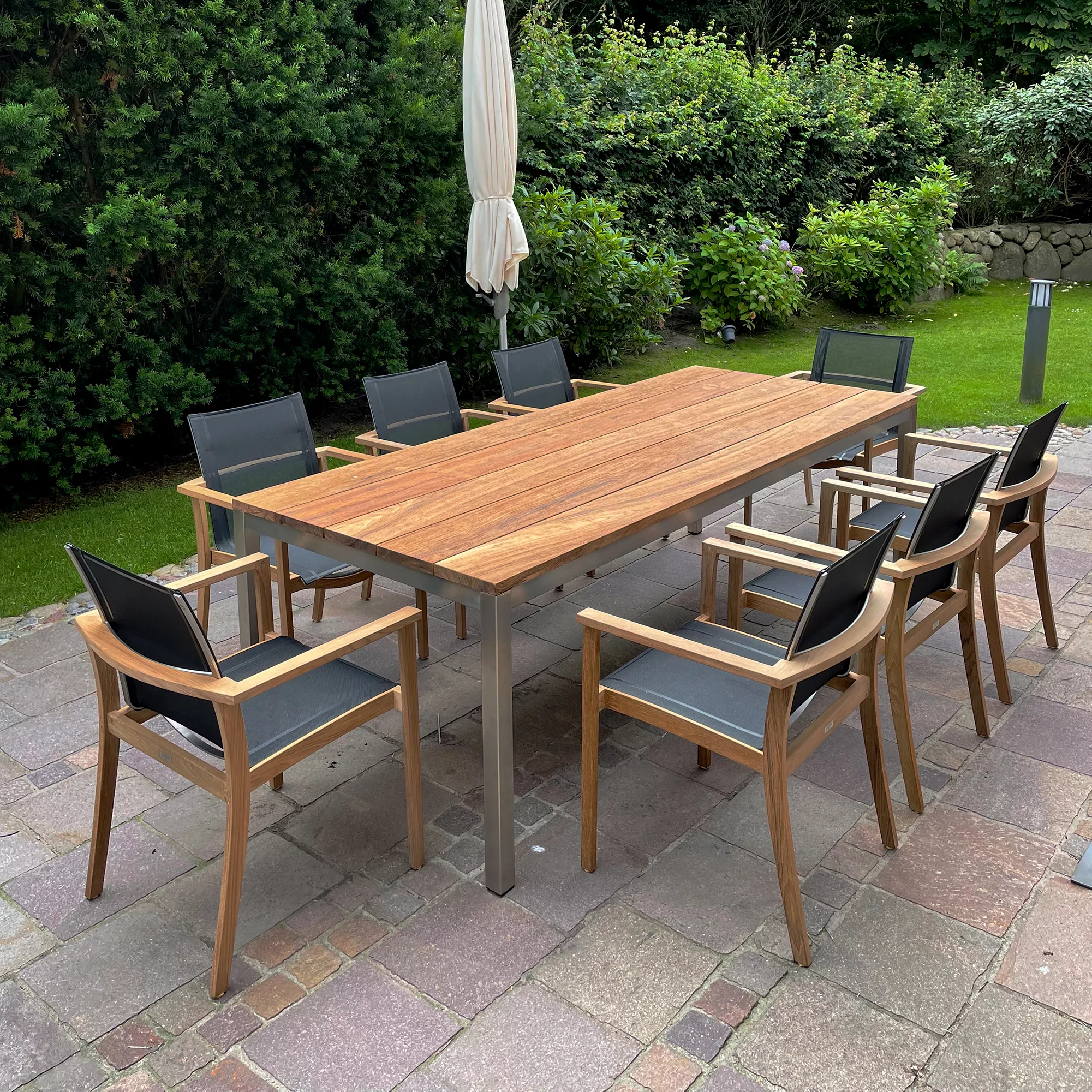 Dieser Esstisch, mit einem kompromisslosen Komfort, besticht durch die elegante Zusammenstellung der hochwertigen Materialien: Teakholz der Güteklasse „A“, und Edelstahlkomponenten.