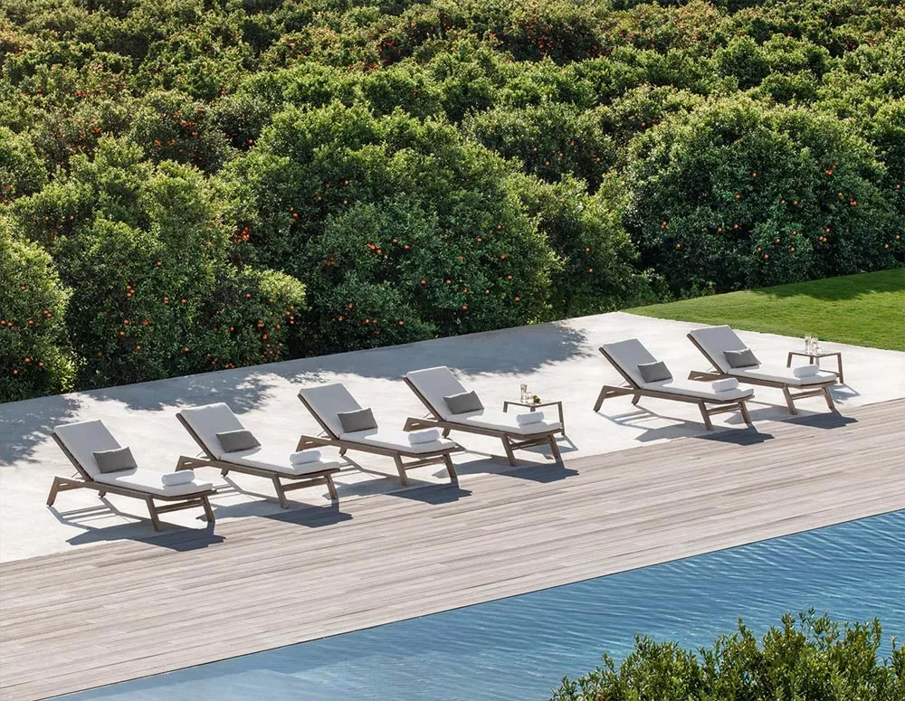 Eine komplette Möbelkollektion, deren roter Faden sich durch die vielfältigen Ausdrucksmöglichkeiten von Holz zieht. Sofas, Liegen und Essgruppen gestalten offene Räume, in denen man komfortabel entspannen und in Harmonie mit der Natur verweilen kann. Runde Tische mit drehbarer Platte oder rechteckige Tische aus der Costes-Kollektion sind eine Ode an die Geselligkeit. Die große Größe bietet Platz für bis zu zehn Personen und ermöglicht komfortables Speisen im Freien und in Kontakt mit der Natur. Eine breite Auswahl an Elementen, stets mit harmonischen und schlichten Linien.