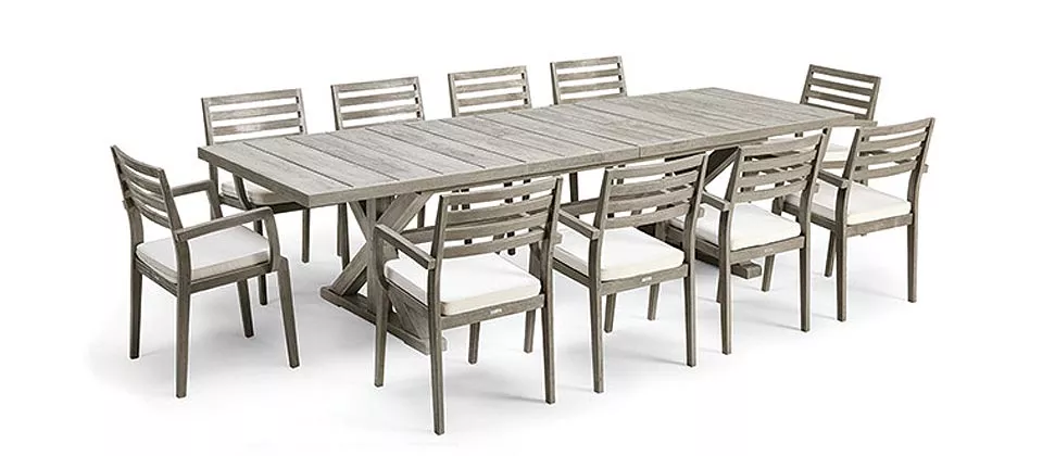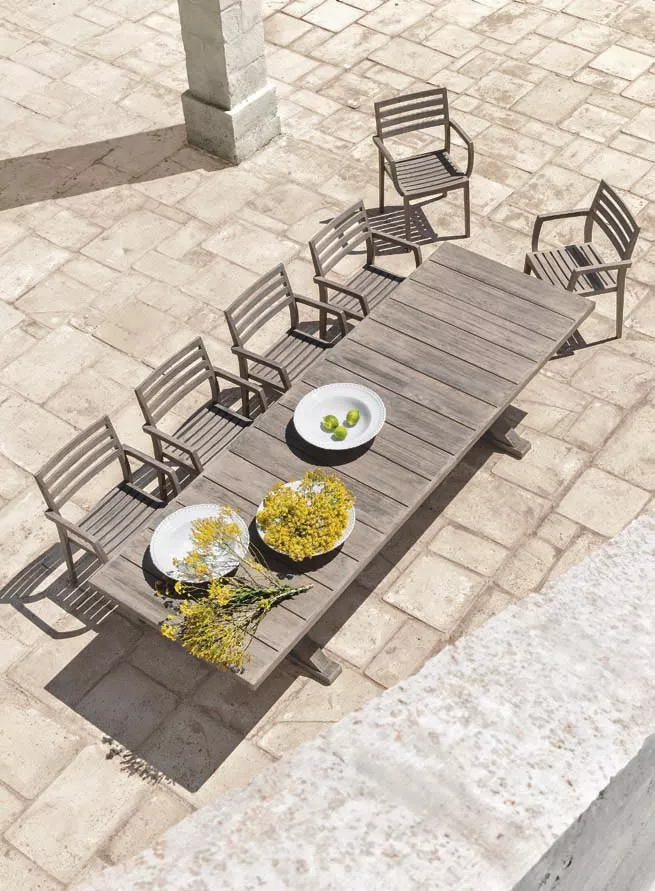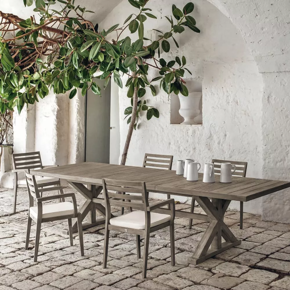 Outdoor Tisch aus Teakholz. Das Untergestell von Tischen Cronos erinnert an solide Tischlerarbeit, die diesem zeitlosen Einrichtungsstück Wärme und Charakter verleiht. Dank ihres angenehm klassischen Stils lassen sich die Sitzmöbel Ambra aus Teakholz, mit oder ohne Armlehnen, mit natürlicher Selbstverständlichkeit vielseitig einsetzen und kombinieren.