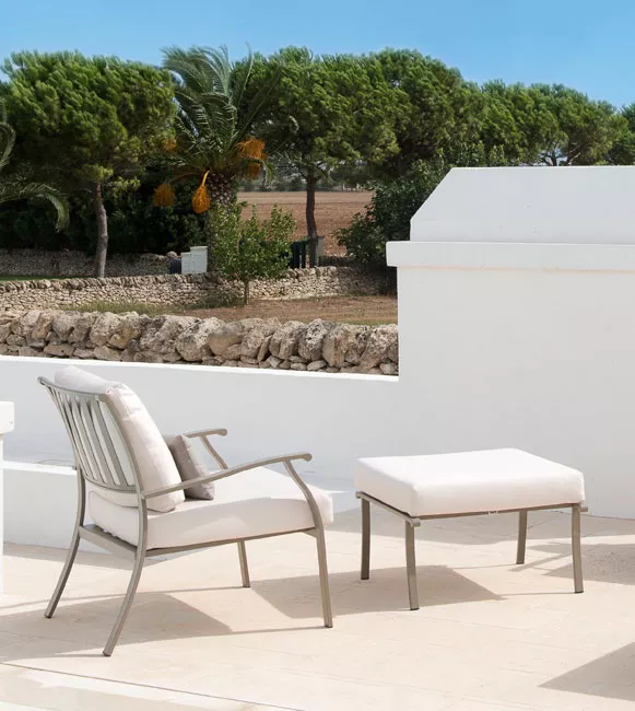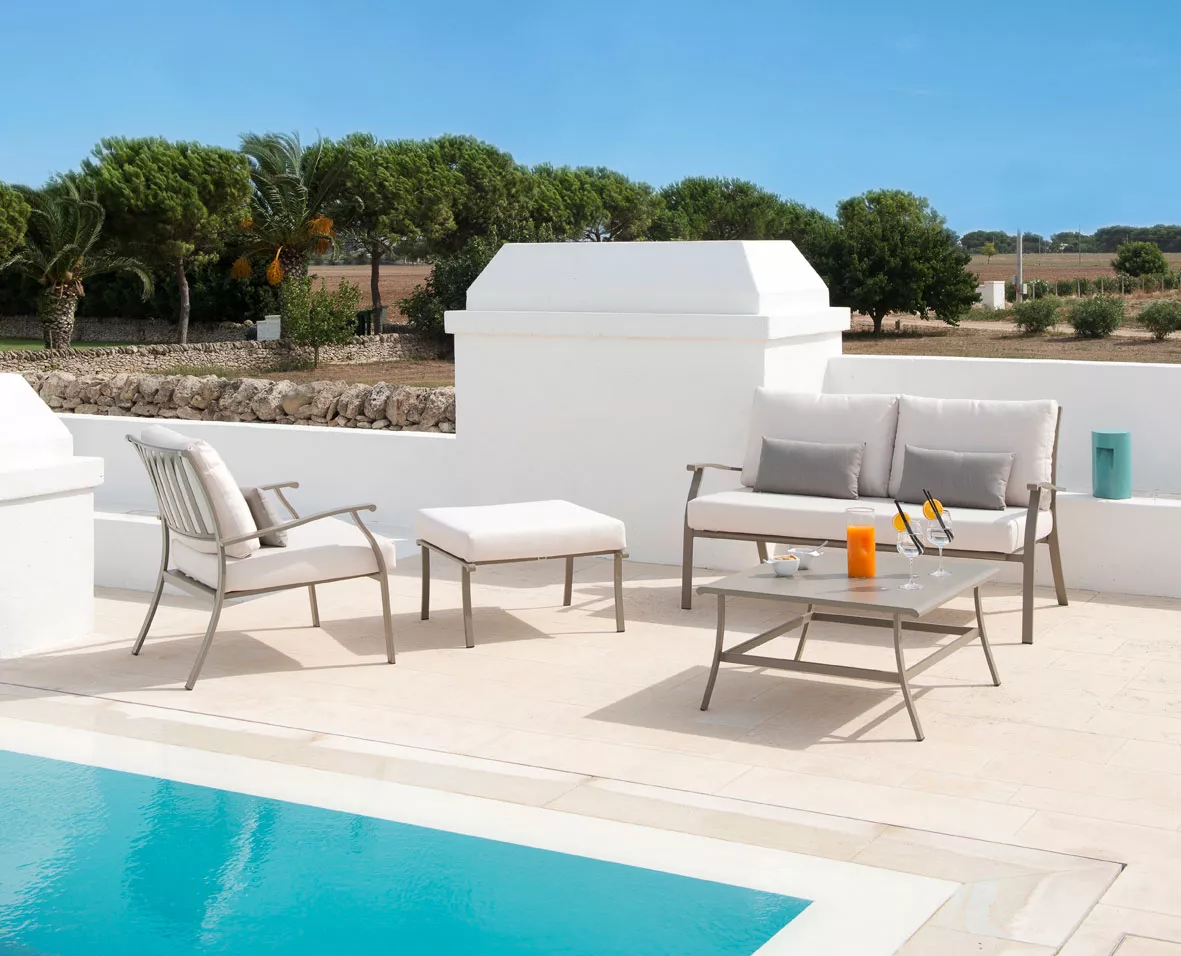 Die Kollektion Elisir von Ethimo ist komplett aus Stahl hergestellt und zeichnet sich durch ein leichtes, ausgewogenes Design, extreme Funktionalität, Zweckmäßigkeit und Robustheit aus. Sie umfasst Tische, Armlehnstühle, Sofas, Kaffeetische sowie verstellbare Sonnenliegen.
