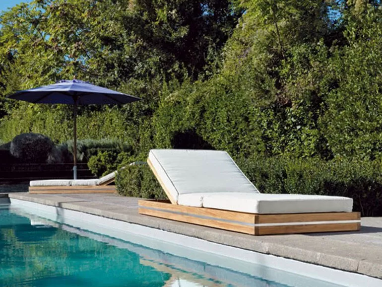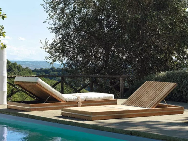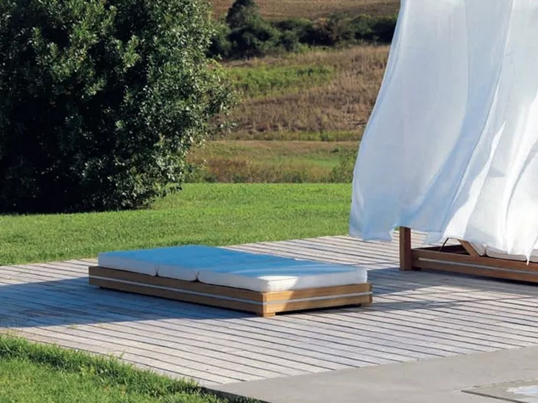 Eine natürliche Harmonie von Linien und Volumen kennzeichnet die Essenza-Kollektion, eine vielseitige und umfangreiche Lösung für das Einrichten, Entspannen und Leben im Freien. Das Einfügen von gebürsteten Stahldetails in den Teakholzrahmen schafft eine markante Verbindung von Technologie und Natur.