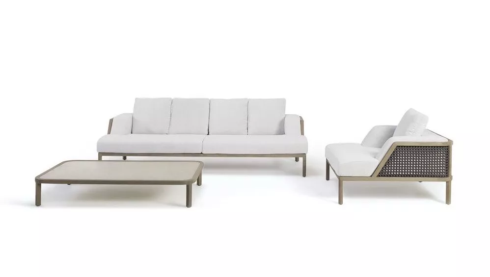 Die Kollektion Grand Life wurde für große und repräsentative Außenbereiche konzipiert. Das natürliche oder gebeizte Teakholz mit Metallkern ist mit großen Kissen überzogen, die Ihnen einen ausgezeichneten Komfort bieten. Die weichen Kissen aus einem Softtouchstoff sind speziell für den Außenbereich geeignet. Die vom klassischen Wiener Strohhalm inspirierte Webart besteht aus einem synthetischen Material, das eine hervorragende Beständigkeit gegen UV-Strahlen und Abrieb bieten.