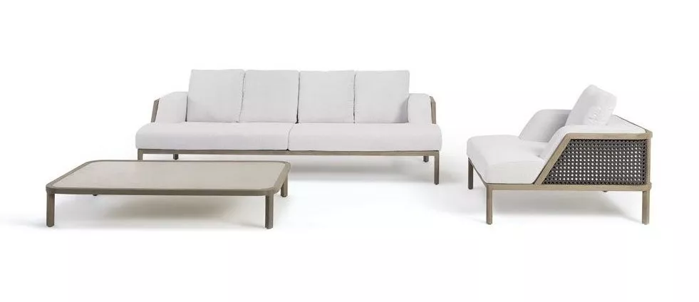 Die Kollektion Grand Life wurde für große und repräsentative Außenbereiche konzipiert. Das natürliche oder gebeizte Teakholz mit Metallkern ist mit großen Kissen überzogen, die Ihnen einen ausgezeichneten Komfort bieten. Die weichen Kissen aus einem Softtouchstoff sind speziell für den Außenbereich geeignet. Die vom klassischen Wiener Strohhalm inspirierte Webart besteht aus einem synthetischen Material, das eine hervorragende Beständigkeit gegen UV-Strahlen und Abrieb bieten.