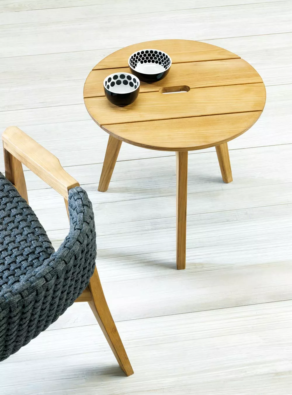 Ethimo Knit Esstisch | 90 x 90 cmDie Kollektion Knit, erstmals vorgestellt auf der Mailänder Möbelmesse 2014, eröffnet die Zusammenarbeit zwischen Ethimo und Patrick Norguet, französischer Stardesigner, der mit modernen, puristischen Formen und stofflichen Empfindungen, einer besonderen Harmonie, Wärme und Schönheit nachspürt. Ethimo hat den Entwurf von Patrick Norguet, eine originelle Synthese aus Ästhetik und Funktion für das Leben im Freien, in Produkte verwandelt, die mit größter Sorgfalt in jedem Detail ausgeführt sind: vom Gestell der Tische und Stühle aus Teakholz bis zum synthetischen Flechtwerk des Lehnstuhls, auf elegante Weise ideal für Garten und Terrasse. Knit ist nicht nur raffiniert, sondern auch intelligent in jedem Detail; so der mittlere Schlitz im runden Tisch, der einen praktischen Griff für seinen Transport abgibt. Teakholz die Herstellung dieser hochwertigen Möbel erfolgt in erstklassiger Qualität UV-, witterungs- und farbbeständig leicht zu reinigen Maße: (B × T × H) 90 x 90 x 76 cmGewicht: 17 kg