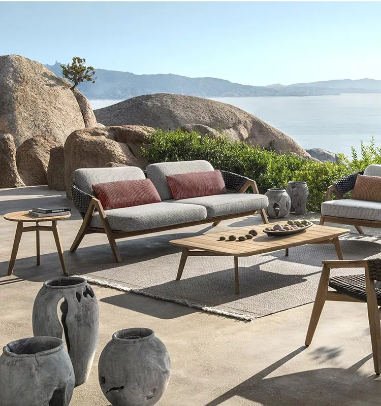 Die Kollektion Knit, erstmals vorgestellt auf der Mailänder Möbelmesse 2014, eröffnet die Zusammenarbeit zwischen Ethimo und Patrick Norguet, französischer Stardesigner, der mit modernen, puristischen Formen und stofflichen Empfindungen, einer besonderen Harmonie, Wärme und Schönheit nachspürt. Ethimo hat den Entwurf von Patrick Norguet, eine originelle Synthese aus Ästhetik und Funktion für das Leben im Freien, in Produkte verwandelt, die mit größter Sorgfalt in jedem Detail ausgeführt sind: vom Gestell der Tische und Stühle aus Teakholz bis zum synthetischen Flechtwerk des Lehnstuhls, auf elegante Weise ideal für Garten und Terrasse. Knit ist nicht nur raffiniert, sondern auch intelligent in jedem Detail; so der mittlere Schlitz im runden Tisch, der einen praktischen Griff für seinen Transport abgibt.