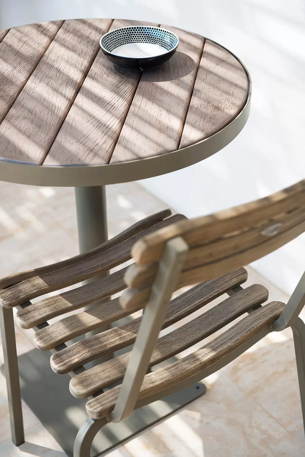 Ethimo Laren Kollektion aus Stahl ist mit Lamellen aus gebeiztem Teakholz ausgestattet, besteht aus einem quadratischen Tisch (90 • 90 cm), einem rechteckigen Tisch (90 • 160 cm) und einem Klappstuhl. Das Gestell der Kollektion ist aus verzinktem Stahl epoxidpulver (schlammgrau) lackiert hergestellt. Die Tischplatten sind aus recyceltem Teakholz, gebeizt gefertigt. Die Klappstühle sind robust, bequem und witterungsbeständig.