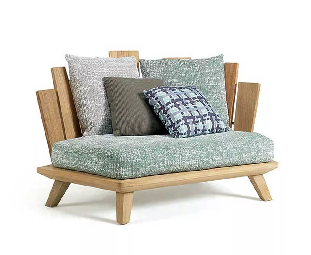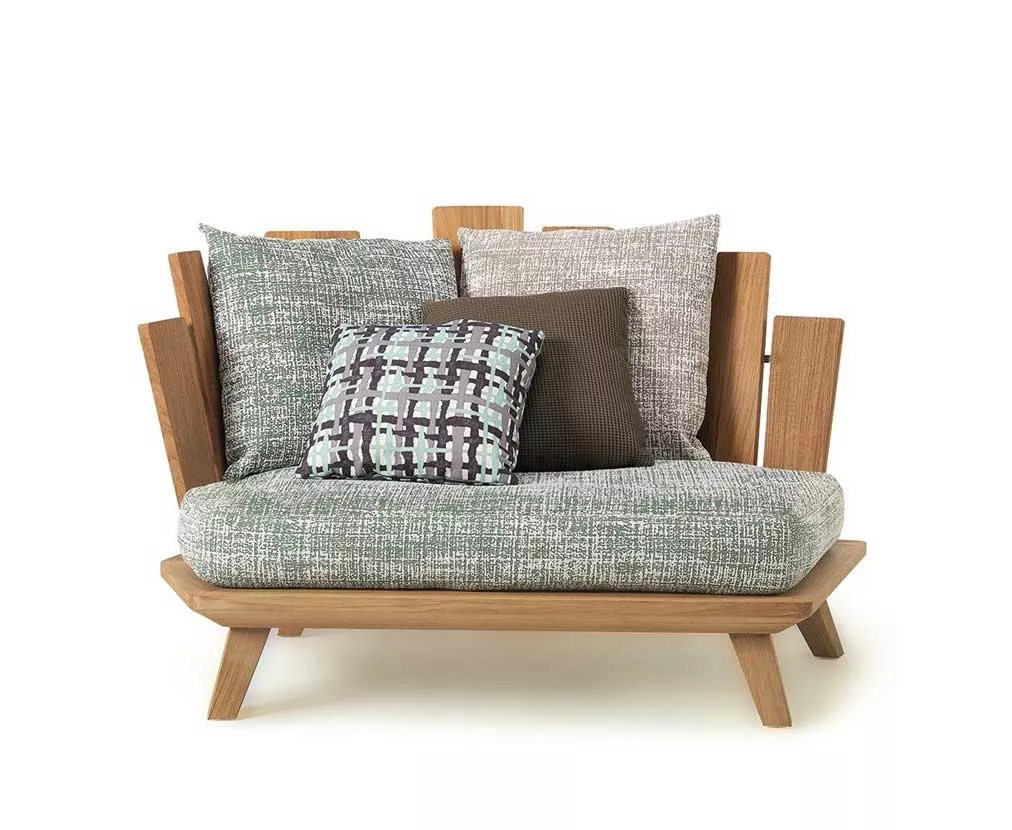 Ethimo Rafael Loungesessel mit Kaffeetisch | L+RRafael ist eine kreative Loungemöbel-Kollektion, die das Sinnbild einer exotischen, aus der zeitgenössischen Vorstellungskraft hervorgehenden Idee präsentiert, die Essenz der faszinierendsten Orte der Welt einfängt, um außergewöhnliche Wohlfühlgefühle zu wecken und neue Outdoor-Wohnerlebnisse zu schaffen. Diese Kollektion wurde kreiert, um die exklusivsten Außenbereiche mit ihrer eigenen Persönlichkeit einzigartig zu machen. Sie nimmt die sich verändernden, facettenreichen Formen der Natur auf und bewahrt ihre vitalen Einflüsse, die in der Stärke ihrer Linien und der rauen Schönheit der Materialien ihren vollen Ausdruck finden. Das moderne Design, die hochwertigen Materialien und Dekoration erzeugen auf diese Weise Gartenmöbel mit einer vielseitigen Seele, robuste, einladende Möbelstücke, die Farbe und Energie ausdrücken. Die feine handwerkliche Verarbeitung von Teak, Marmor und Lavastein kombiniert sich mit der raffinierten Auswahl an Stofffarben, die von Paola Navone entworfen wurden und die Polstermöbel aufwerten.Teak Das von Ethimo ausgewählte Teakholz stammt aus den kontrollierten Plantagen Thailands und Indonesiens. Es ist ein hervorragendes Material hochwertiger Qualität, ideal für die Herstellung von Gartenmöbeln, da es auch bei Temperaturschwankungen, Wasser, Feuchtigkeit und Salz extrem haltbar ist. Gebeiztes Teak Um dem Teakholz bester Qualität einen Vintage–Charme zu verleihen, wird dieses gebeizt. Vor allem wird es gebürstet, so dass die Oberfläche rauer wird und älter erscheint, indem ihm seine natürliche ölige Patina genommen wird. Dann wird es mit einer Behandlung geschützt, die es von Anfang an Grau erscheinen lässt. Mit der Zeit nimmt es die natürliche silbergraue Patina unbehandelten Teakholzes an und erhält beim anfassen den gebürsteten Touch. Diese Art Teakholz darf nicht mit Öl behandelt, sondern nur mit Wasser und Seife gewaschen werden.Teakholzgestell (gebeizt oder natur) die Herstellung dieser hochwertigen Möbel erfolgt in erstklassiger Qualität UV-, witterungs- und farbbeständig leicht zu reinigenArmlehne links oder rechts (sitzend) Maße (B x T x H):208 x 110 x 90 cmSitzhöhe: 38 cm