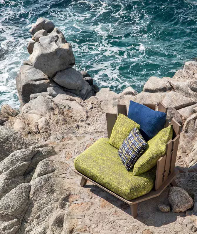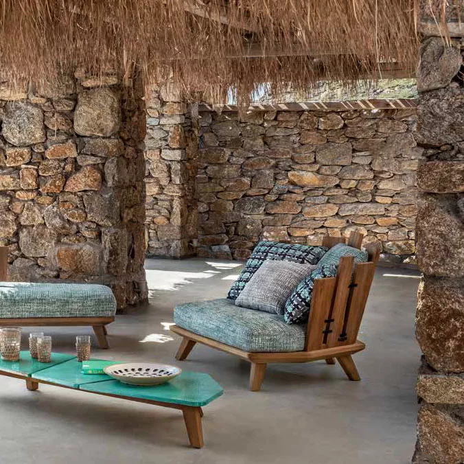 Rafael ist eine kreative Loungemöbel-Kollektion, die das Sinnbild einer exotischen, aus der zeitgenössischen Vorstellungskraft hervorgehenden Idee präsentiert, die Essenz der faszinierendsten Orte der Welt einfängt, um außergewöhnliche Wohlfühlgefühle zu wecken und neue Outdoor-Wohnerlebnisse zu schaffen. Diese Kollektion wurde kreiert, um die exklusivsten Außenbereiche mit ihrer eigenen Persönlichkeit einzigartig zu machen. Sie nimmt die sich verändernden, facettenreichen Formen der Natur auf und bewahrt ihre vitalen Einflüsse, die in der Stärke ihrer Linien und der rauen Schönheit der Materialien ihren vollen Ausdruck finden. Das moderne Design, die hochwertigen Materialien und Dekoration erzeugen auf diese Weise Gartenmöbel mit einer vielseitigen Seele, robuste, einladende Möbelstücke, die Farbe und Energie ausdrücken. Die feine handwerkliche Verarbeitung von Teak, Marmor und Lavastein kombiniert sich mit der raffinierten Auswahl an Stofffarben, die von Paola Navone entworfen wurden und die Polstermöbel aufwerten.