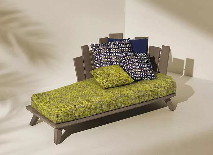 Ethimo Rafael Daybed | L+RRafael ist eine kreative Loungemöbel-Kollektion, die das Sinnbild einer exotischen, aus der zeitgenössischen Vorstellungskraft hervorgehenden Idee präsentiert, die Essenz der faszinierendsten Orte der Welt einfängt, um außergewöhnliche Wohlfühlgefühle zu wecken und neue Outdoor-Wohnerlebnisse zu schaffen. Diese Kollektion wurde kreiert, um die exklusivsten Außenbereiche mit ihrer eigenen Persönlichkeit einzigartig zu machen. Sie nimmt die sich verändernden, facettenreichen Formen der Natur auf und bewahrt ihre vitalen Einflüsse, die in der Stärke ihrer Linien und der rauen Schönheit der Materialien ihren vollen Ausdruck finden. Das moderne Design, die hochwertigen Materialien und Dekoration erzeugen auf diese Weise Gartenmöbel mit einer vielseitigen Seele, robuste, einladende Möbelstücke, die Farbe und Energie ausdrücken. Die feine handwerkliche Verarbeitung von Teak, Marmor und Lavastein kombiniert sich mit der raffinierten Auswahl an Stofffarben, die von Paola Navone entworfen wurden und die Polstermöbel aufwerten.Teak Das von Ethimo ausgewählte Teakholz stammt aus den kontrollierten Plantagen Thailands und Indonesiens. Es ist ein hervorragendes Material hochwertiger Qualität, ideal für die Herstellung von Gartenmöbeln, da es auch bei Temperaturschwankungen, Wasser, Feuchtigkeit und Salz extrem haltbar ist. Gebeiztes Teak Um dem Teakholz bester Qualität einen Vintage–Charme zu verleihen, wird dieses gebeizt. Vor allem wird es gebürstet, so dass die Oberfläche rauer wird und älter erscheint, indem ihm seine natürliche ölige Patina genommen wird. Dann wird es mit einer Behandlung geschützt, die es von Anfang an Grau erscheinen lässt. Mit der Zeit nimmt es die natürliche silbergraue Patina unbehandelten Teakholzes an und erhält beim anfassen den gebürsteten Touch. Diese Art Teakholz darf nicht mit Öl behandelt, sondern nur mit Wasser und Seife gewaschen werden.Teakholzgestell (gebeizt oder natur) die Herstellung dieser hochwertigen Möbel erfolgt in erstklassiger Qualität UV-, witterungs- und farbbeständig leicht zu reinigenArmlehne links oder rechts (sitzend) Maße (B x T x H):208 x 110 x 90 cmSitzhöhe: 38 cm