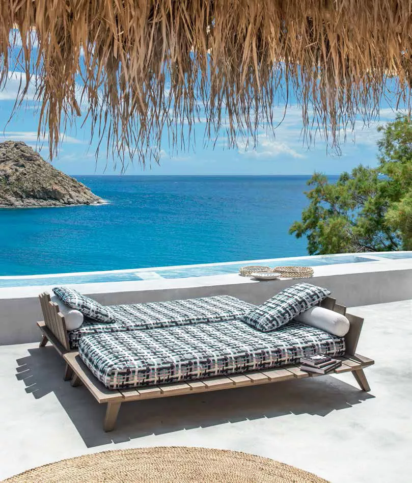 Ethimo Rafael SonnenliegeRafael ist eine kreative Loungemöbel-Kollektion, die das Sinnbild einer exotischen, aus der zeitgenössischen Vorstellungskraft hervorgehenden Idee präsentiert, die Essenz der faszinierendsten Orte der Welt einfängt, um außergewöhnliche Wohlfühlgefühle zu wecken und neue Outdoor-Wohnerlebnisse zu schaffen. Diese Kollektion wurde kreiert, um die exklusivsten Außenbereiche mit ihrer eigenen Persönlichkeit einzigartig zu machen. Sie nimmt die sich verändernden, facettenreichen Formen der Natur auf und bewahrt ihre vitalen Einflüsse, die in der Stärke ihrer Linien und der rauen Schönheit der Materialien ihren vollen Ausdruck finden. Das moderne Design, die hochwertigen Materialien und Dekoration erzeugen auf diese Weise Gartenmöbel mit einer vielseitigen Seele, robuste, einladende Möbelstücke, die Farbe und Energie ausdrücken. Die feine handwerkliche Verarbeitung von Teak, Marmor und Lavastein kombiniert sich mit der raffinierten Auswahl an Stofffarben, die von Paola Navone entworfen wurden und die Polstermöbel aufwerten.Teak Das von Ethimo ausgewählte Teakholz stammt aus den kontrollierten Plantagen Thailands und Indonesiens. Es ist ein hervorragendes Material hochwertiger Qualität, ideal für die Herstellung von Gartenmöbeln, da es auch bei Temperaturschwankungen, Wasser, Feuchtigkeit und Salz extrem haltbar ist. Gebeiztes Teak Um dem Teakholz bester Qualität einen Vintage–Charme zu verleihen, wird dieses gebeizt. Vor allem wird es gebürstet, so dass die Oberfläche rauer wird und älter erscheint, indem ihm seine natürliche ölige Patina genommen wird. Dann wird es mit einer Behandlung geschützt, die es von Anfang an Grau erscheinen lässt. Mit der Zeit nimmt es die natürliche silbergraue Patina unbehandelten Teakholzes an und erhält beim anfassen den gebürsteten Touch. Diese Art Teakholz darf nicht mit Öl behandelt, sondern nur mit Wasser und Seife gewaschen werden.Teakholzgestell (gebeizt oder natur) die Herstellung dieser hochwertigen Möbel erfolgt in erstklassiger Qualität UV-, witterungs- und farbbeständig leicht zu reinigen Maße (B x T x H):215 x 138 x 72 cmSitzhöhe: 38 cmGewicht: 40 kg