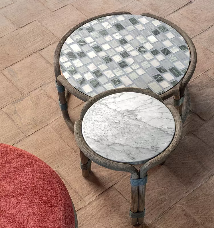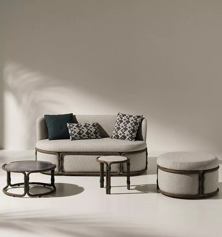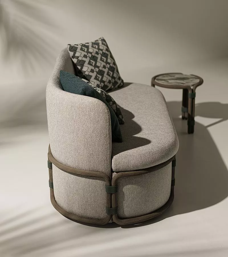 Rotin ist eine Lounge-Kollektion, die Geschichte einer modernen Art des Denkens und des Genießens, von Orten der Entspannung im Freien neu definiert. Rotin besteht aus einem Sofa, einem Loungesessel, einem Couchtisch und einem Hocker mit einem Gestell aus gebeiztem Teakholz. Sie ist von der asiatischen Tradition inspiriert, in der Bambus als das Hauptelement für die Einrichtung von Außenbereichen dient, zusammen mit Techniken, die normalerweise für die Herstellung von Rattanmöbeln verwendet werden.