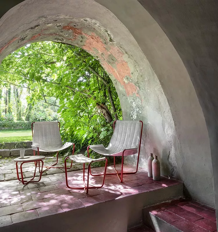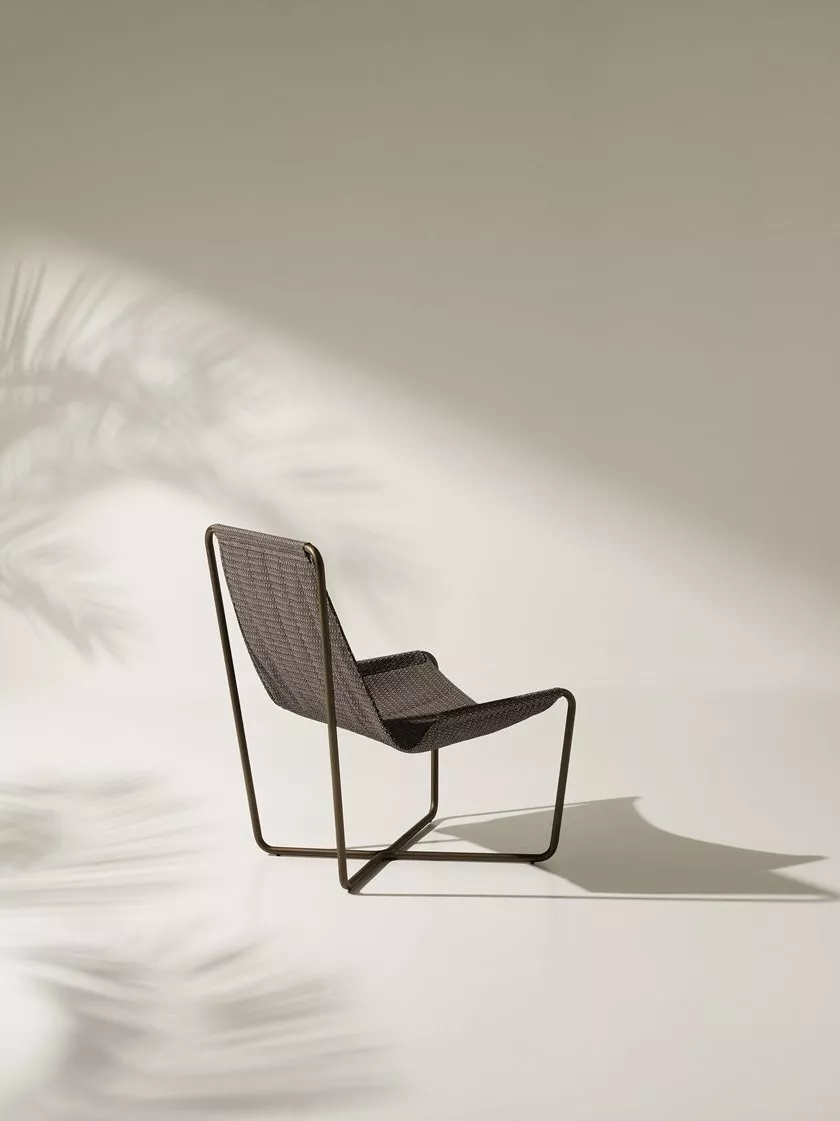 Der Sling-Stuhl wird durch einen Couchtisch mit passendem Stahlgestell und einer Platte aus einer speziellen pigmentierten Betonmischung ergänzt, die seine Textur hervorhebt, ihm Leichtigkeit verleiht und die Solidität und Kompaktheit dieses Materials auf elegante und originelle Weise betont. Ethimo und Studiopepe haben sich zu einem Projekt zusammengetan, das sich durch ungewöhnliche Farb- und Materialkombinationen auszeichnet und an die entspannte Eleganz erinnert, die für den Urlaub so typisch ist.