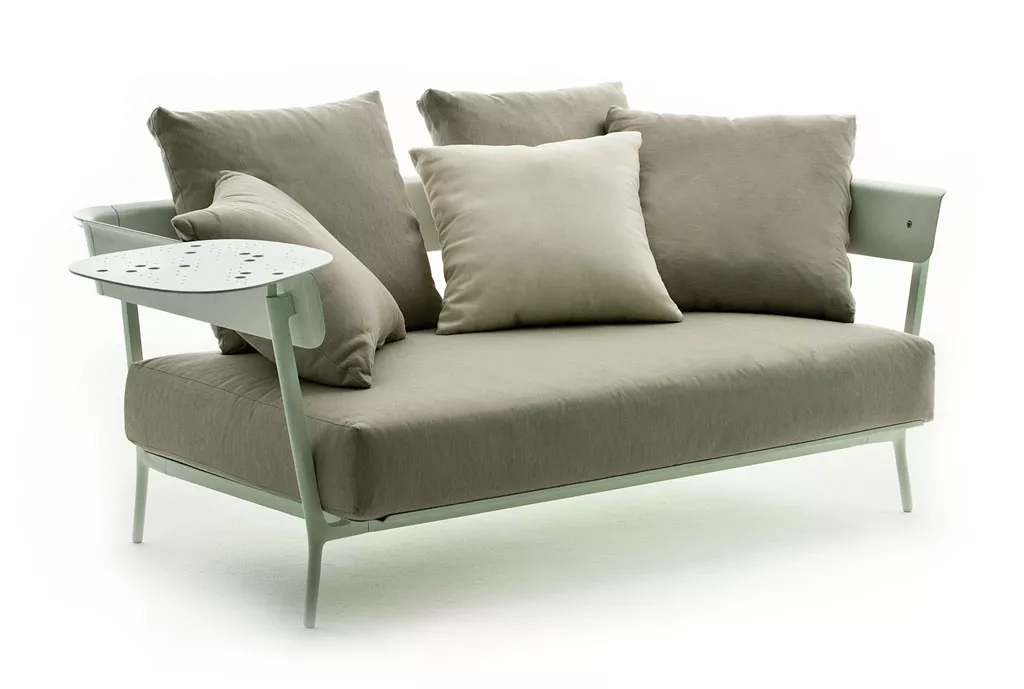 Fast Aikana 3-Sitzer-Sofa | mit Armlehnen Aikana ist eine Gruppe von modulierbaren Elementen - inspiriert durch die Atmosphäre der 1950er Jahre - erstellt und konzipiert für den Innen- und Außenbereich, so dass Wohn-und Außenbereiche mit Harmonie und Stil eingerichtet werden können. Oberfläche Durch den Einsatz von Aluminium in Kombination mit Sunbrella® Stoff ist die gesamte Aikana Kollektion sehr witterungsbeständig. Stoffe Aikana Polster- und Kissenbezüge werden mit dem wasserabweichenden Sunbrella® Stoff hergestellt, der speziell für den Außeneinsatz ausgelegt ist. Maße (B × T × H): 218 × 89 × 64 cmSitzhöhe: 37 cmGewicht: 57 kg