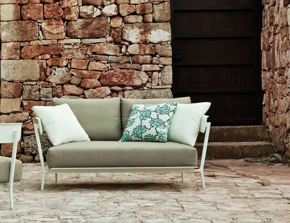 Fast Aikana 2-Sitzer-Sofa | ohne Armlehnen Aikana ist eine Gruppe von modulierbaren Elementen - inspiriert durch die Atmosphäre der 1950er Jahre - erstellt und konzipiert für den Innen- und Außenbereich, so dass Wohn-und Außenbereiche mit Harmonie und Stil eingerichtet werden können. Oberfläche Durch den Einsatz von Aluminium in Kombination mit Sunbrella® Stoff ist die gesamte Aikana Kollektion sehr witterungsbeständig. Stoffe Aikana Polster- und Kissenbezüge werden mit dem wasserabweichenden Sunbrella® Stoff hergestellt, der speziell für den Außeneinsatz ausgelegt ist. Maße (B × T × H): 132 × 89 × 64 cmSitzhöhe: 37 cmGewicht: 40 kg