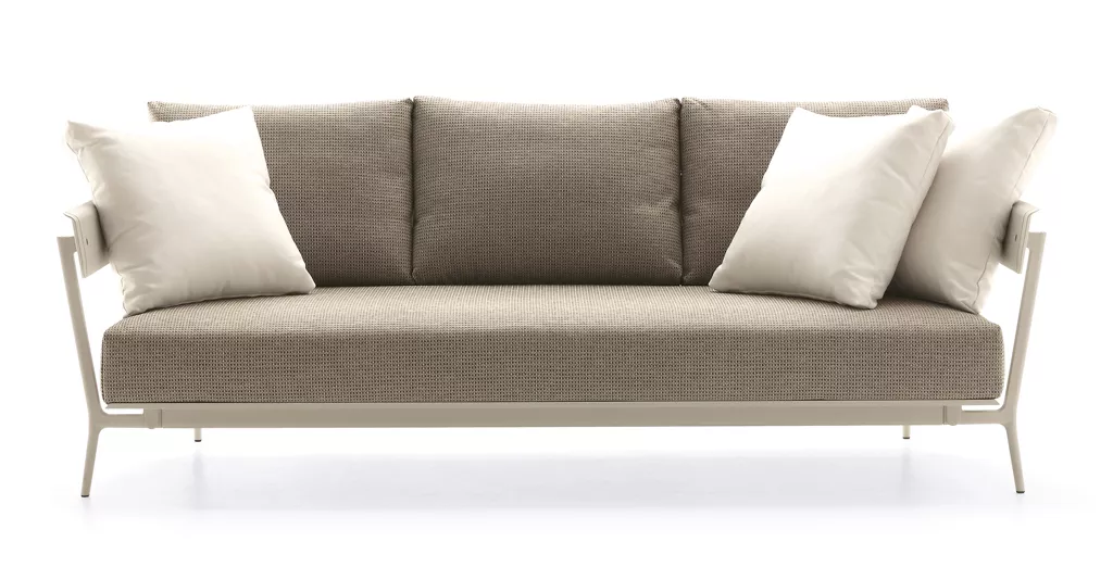 Fast Aikana 3-Sitzer-Sofa | Armlehne L+R Aikana ist eine Gruppe von modulierbaren Elementen - inspiriert durch die Atmosphäre der 1950er Jahre - erstellt und konzipiert für den Innen- und Außenbereich, so dass Wohn-und Außenbereiche mit Harmonie und Stil eingerichtet werden können. Oberfläche Durch den Einsatz von Aluminium in Kombination mit Sunbrella® Stoff ist die gesamte Aikana Kollektion sehr witterungsbeständig. Stoffe Aikana Polster- und Kissenbezüge werden mit dem wasserabweichenden Sunbrella® Stoff hergestellt, der speziell für den Außeneinsatz ausgelegt ist.Armlehne links oder rechts (sitzend) Maße (B × T × H): 208 × 89 × 64 cmSitzhöhe: 37 cmGewicht: 52 kg