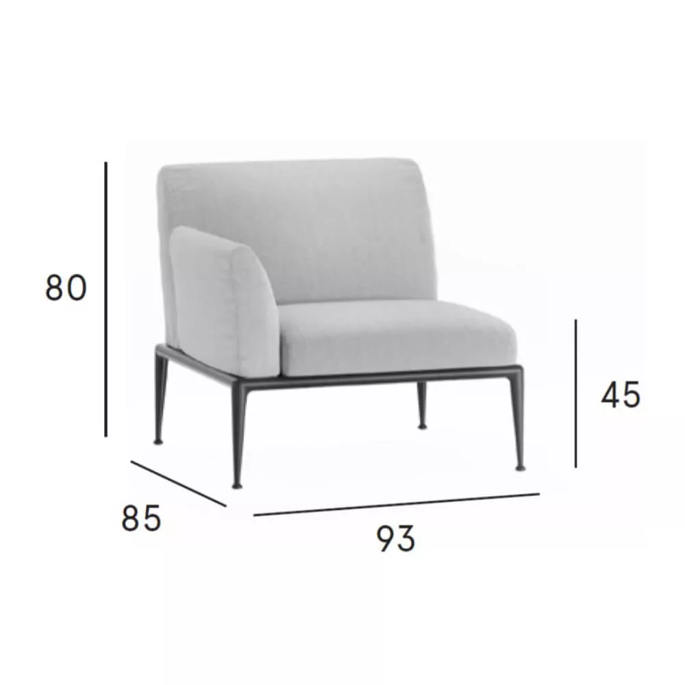 Fast New Joint Sessel | mit Armlehnen Fast New Joint ist eine auffallend elegante Gartenmöbel Kollektion mit einem unverwechselbaren Design, eine Loungegruppe, die für Innen- und Außeneinsatz perfekt geeignet ist. Der Werkstoff Aluminium ist für Outdoor Möbel eines der geeignetsten Materialien überhaupt. Sein geringes Gewicht, die Haltbarkeit, hervorragende statische Eigenschaften und nahezu unbegrenzte Möglichkeiten in der Be- und Verarbeitung ermöglichen eine Vielfalt gestalterischer Optionen. Dank sehr gutem Design genügen die Joint Loungemodule den höchsten Ansprüchen in Ästhetik und Verarbeitung und gleichzeitig entsprechen sie dem Zeitgeist in all seinen Facetten. Die Gestelle bestehen aus extrudierten und im Druckgussverfahren gefertigten Elementen aus Aluminium und sind mit pulverbeschichteter Oberfläche in 14 verschiedenen Farben verfügbar. Oberfläche Durch den Einsatz von Aluminium in Kombination mit Sunbrella® Stoff ist die gesamte New Joint Kollektion sehr witterungsbeständig. Stoffe New Joint Polster- und Kissenbezüge werden mit dem wasserabweichenden Sunbrella® Stoff hergestellt, der speziell für den Außeneinsatz ausgelegt ist. Maße (B × T × H):99 × 85 × 80 cmSitzhöhe: 45 cmGewicht: 45 kg