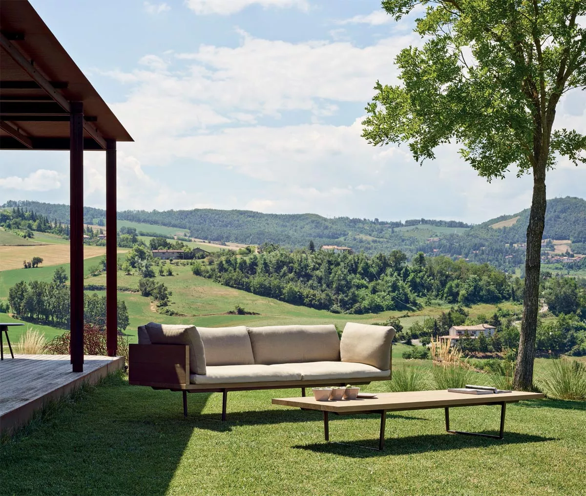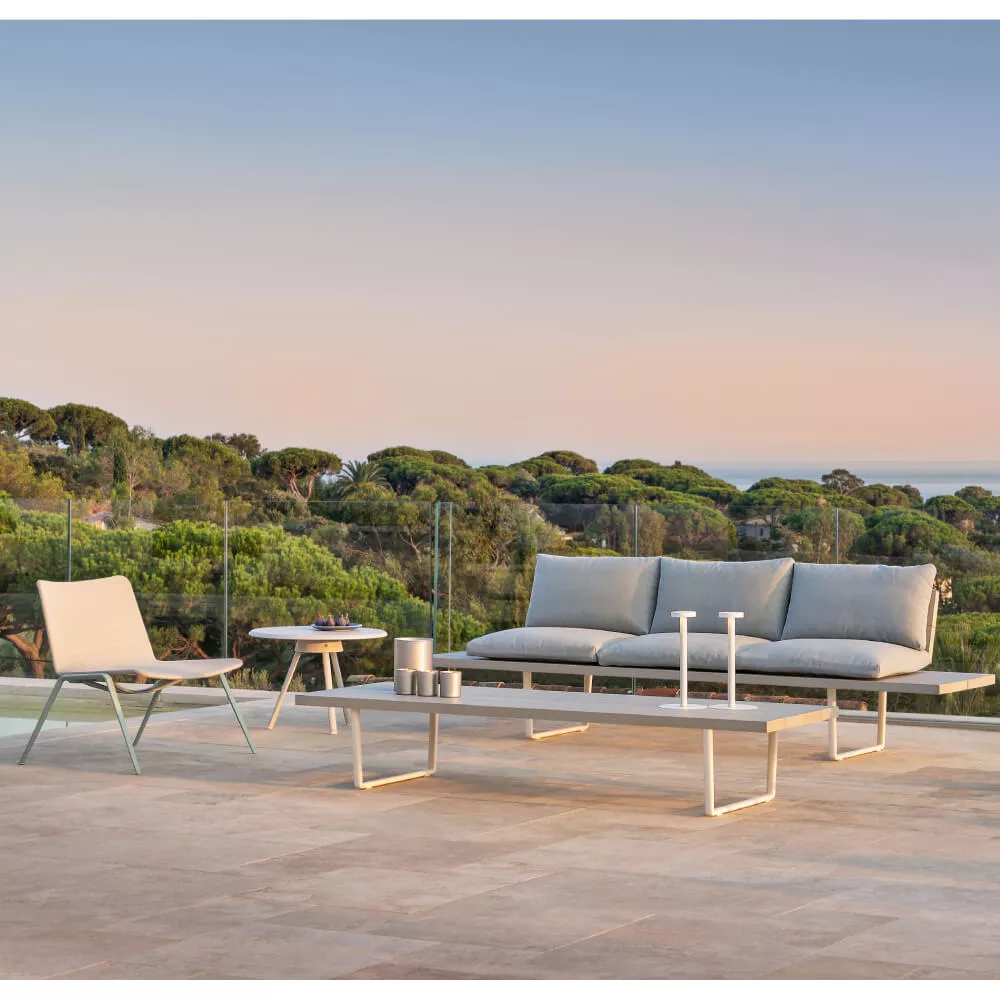 Zwischen Natur und Technologie. Mit „greifbarem“ Ergebnis. Pulverbeschichtetes Aluminium ist beständig gegen Regen, Wind, Kälte und den Wechsel der Jahreszeiten. Die umfassende Kollektion besticht mit robusten, schlichten Formen, die an moderne Interpretationen klassischer Holzbänke denken lassen. Bei Bedarf können die Sofas, Bänke und Chaiselongues der Serie Orizon außerdem mit bequemen outdoortauglichen Kissen ausgestattet werden, um herrlich gemütliche und einladende „Freiluft-Wohnzimmer“ zu gestalten.