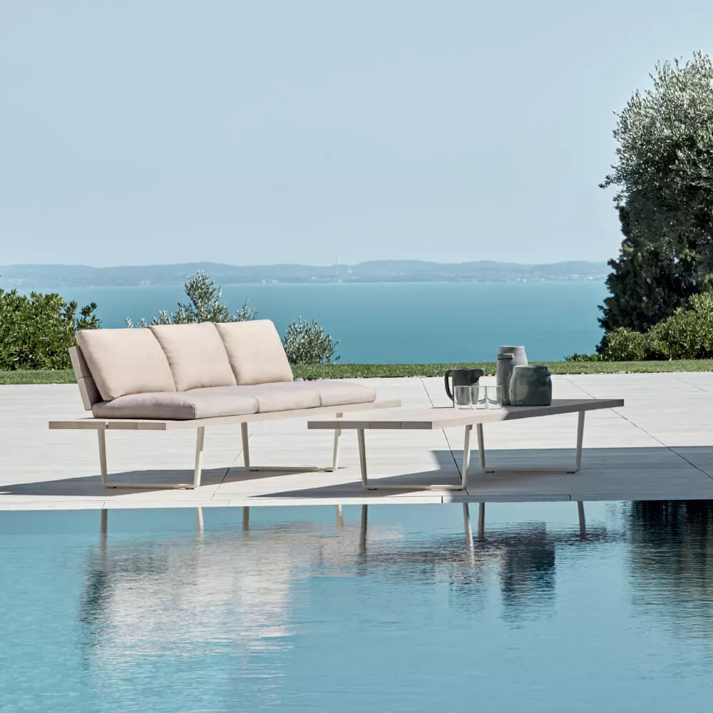 Zwischen Natur und Technologie. Mit „greifbarem“ Ergebnis. Pulverbeschichtetes Aluminium ist beständig gegen Regen, Wind, Kälte und den Wechsel der Jahreszeiten. Die umfassende Kollektion besticht mit robusten, schlichten Formen, die an moderne Interpretationen klassischer Holzbänke denken lassen. Bei Bedarf können die Sofas, Bänke und Chaiselongues der Serie Orizon außerdem mit bequemen outdoortauglichen Kissen ausgestattet werden, um herrlich gemütliche und einladende „Freiluft-Wohnzimmer“ zu gestalten.