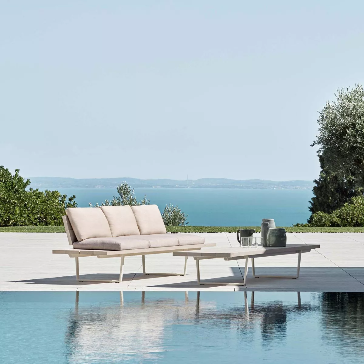 Zwischen Natur und Technologie. Mit „greifbarem“ Ergebnis. Pulverbeschichtetes Aluminium ist beständig gegen Regen, Wind, Kälte und den Wechsel der Jahreszeiten. Die umfassende Kollektion besticht mit robusten, schlichten Formen, die an moderne Interpretationen klassischer Holzbänke denken lassen. Bei Bedarf können die Sofas, Bänke und Chaiselongues der Serie Orizon außerdem mit bequemen outdoortauglichen Kissen ausgestattet werden, um herrlich gemütliche und einladende „Freiluft-Wohnzimmer“ zu gestalten.