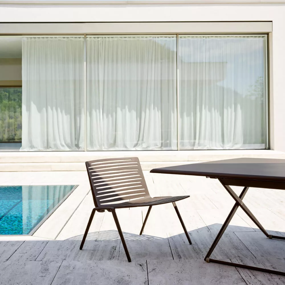 Die Begegnung zwischen der Festigkeit des Materials und dem geringen Gewicht der Formen. In der Zebra-Kollektion wird der Aluminiumdruckguss durch Entfernen strukturiert, was mit einem Spiel von Blöcken und Hohlräumen, die von der Sonne beleuchtet werden, faszinierende geometrische Formen auf dem Boden erzeugt. Für noch mehr Komfort stehen Kissen für Sitz und Rückenlehne zur Verfügung, die mit für den Außenbereich geeigneten Stoffen bezogen sind: wasserfest, schmutzabweisend, UV-beständig und abriebfest. Die Zebra-Kollektion, die sowohl für den Wohn- als auch für den Objektbereich geeignet ist, umfasst: Sessel, Armlehnenstuhl, Loungesessel, dreifach höhenverstellbaren Up & Down-Tisch, Beistelltische mit Aluminium- und HPL-Platten sowie Kaffeetische.