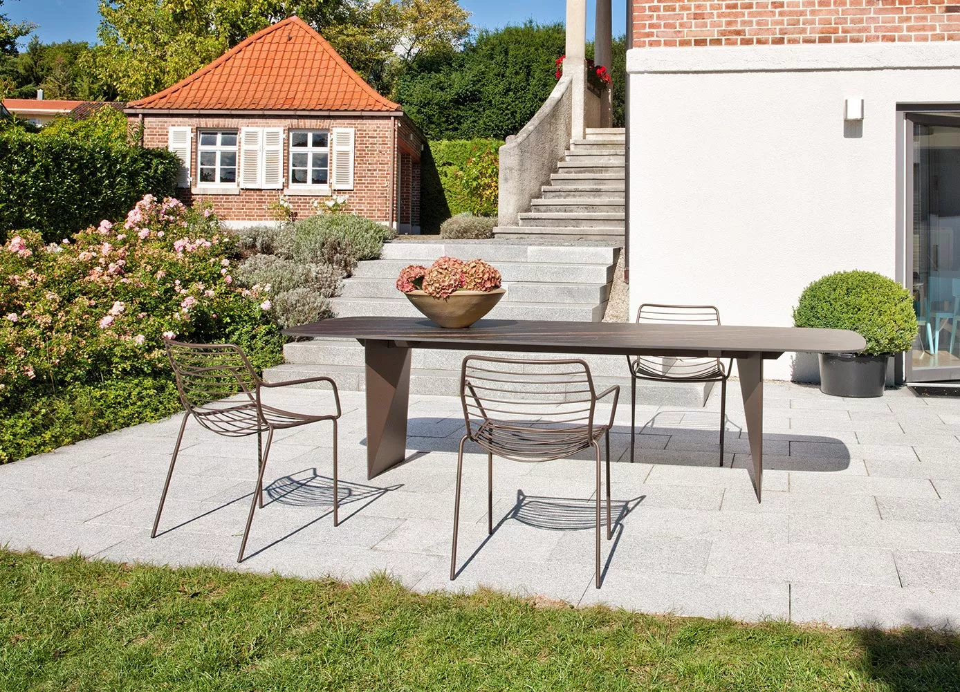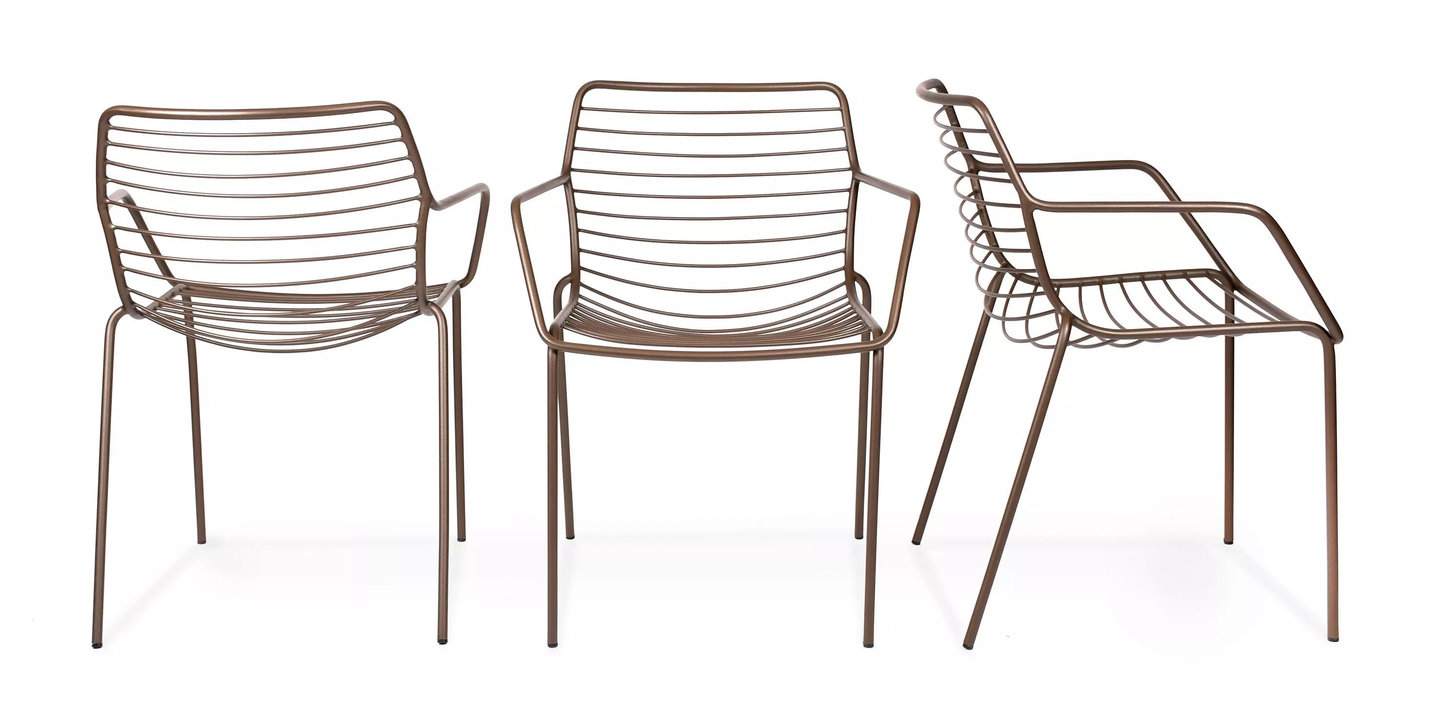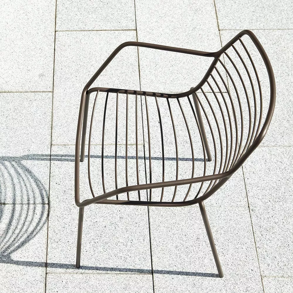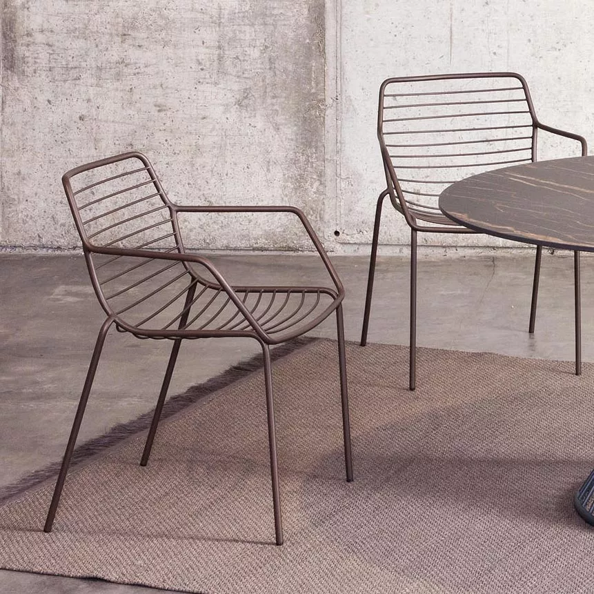 Leicht, stapelbar, und bequem. Zudem nur aus einem besonders wetterfesten und pflegefreien Material hergestellt: Edelstahl, pulverbeschichtet in dark bronze oder anthrazit. Ein Sessel der durch seine transparente Form sich nicht aufdrängt sondern elegant sich im Außenbereich einfügt. Eine ideale Kombination stellt der neue Claris Säulentisch, ein besonderes Highlight für den Außenbereich. Für große Terrassen empfehlen wir den Tierra Tisch. Für Bequemlichkeit sorgen die gesteppten Auflagen für Sitz oder Sitz und Rücken.