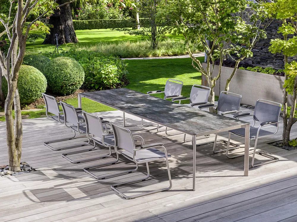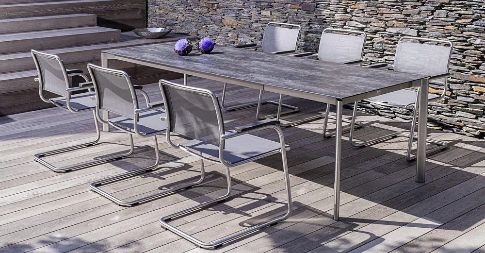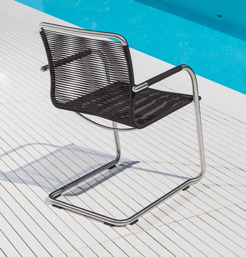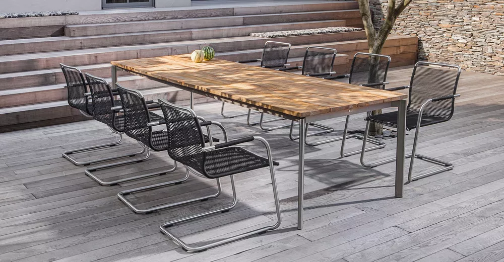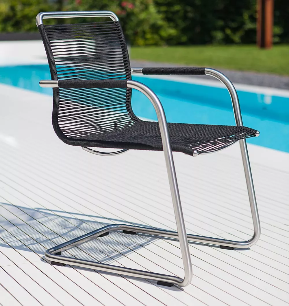 Swing lädt zum Entspannen ein. Ein klassischer Freischwinger der höchsten Ansprüchen gerecht wird, in Formgebung, Material und Sitzkomfort. Hergestellt wird Swing aus hochwertigem Edelstahl und Outdoor Gewebe, Teak oder dem dauerelsastischen fm-rope. Die Armlehnen sind aus Teak oder in soft-touch Ausführung. Die passenden Tische werden in verschiedenen Größen angeboten.