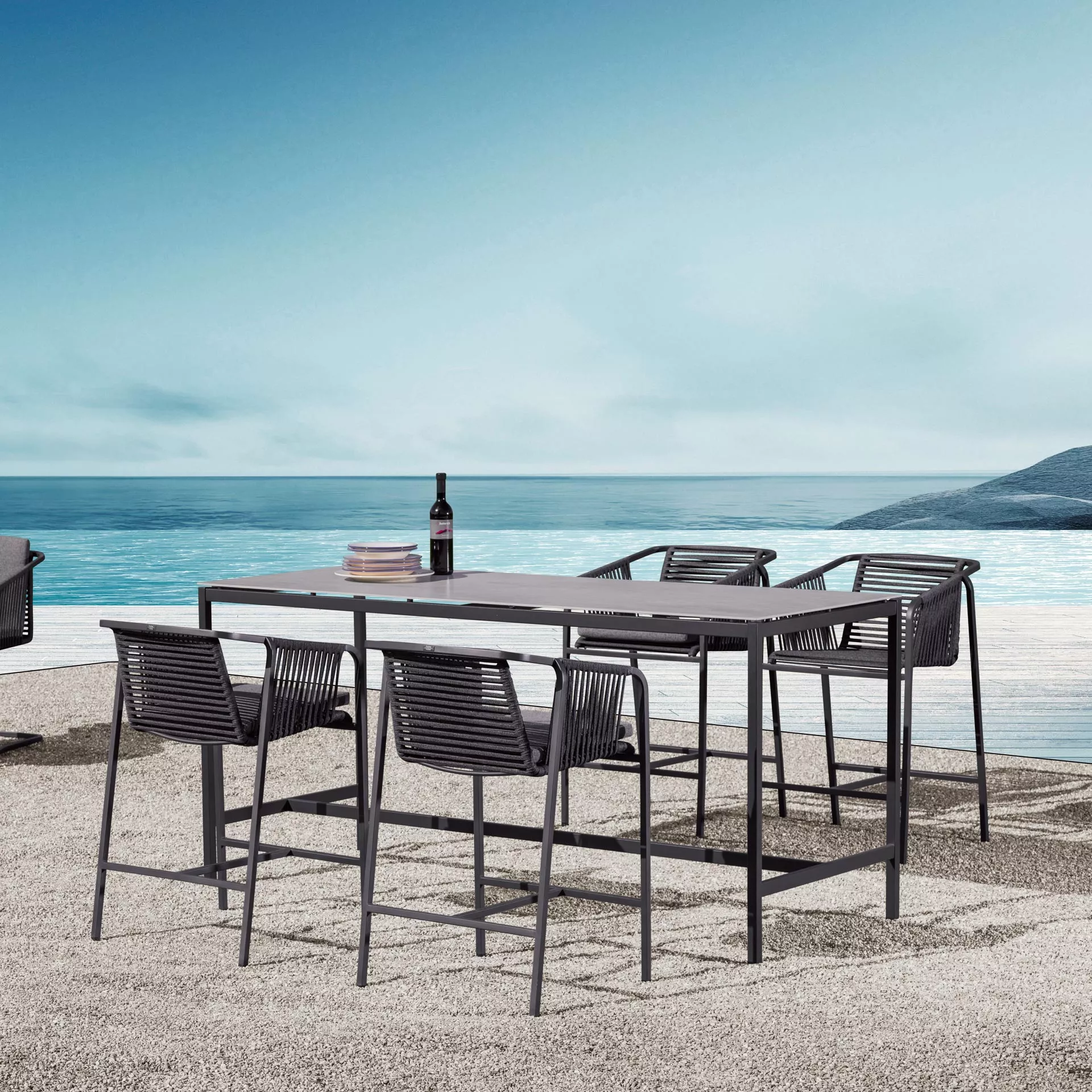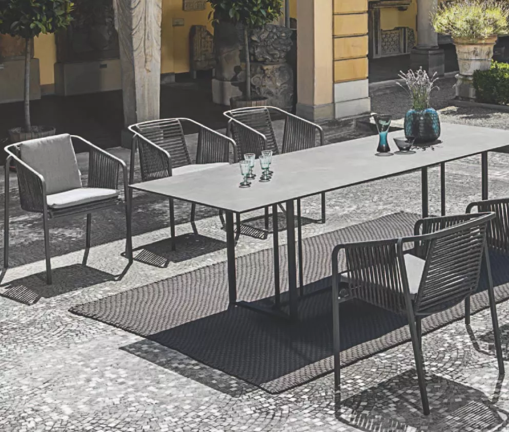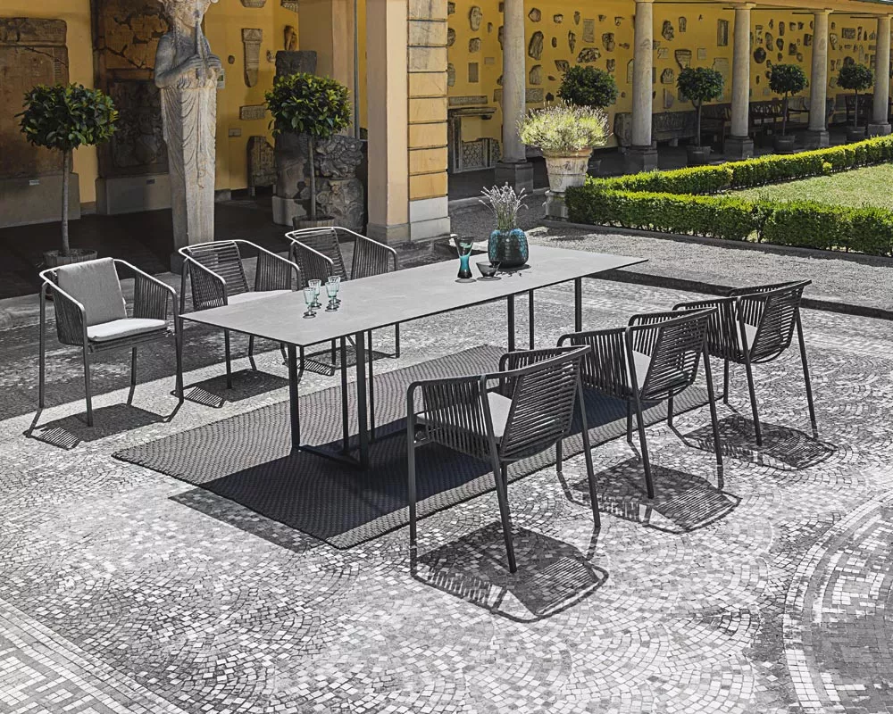 In architektonisch klarem, urbanem Design zeigt sich die Kollektion Suite. Dieser nachhaltige Entwurf stellt eine spannende Kombination von exzellent verarbeitetem Edelstahl und weichen, wetterfesten Stoffen dar. Sessel in Edelstahl anthrazit matt Strukturlack mit fm-flat rope Basalt oder Granit / armchair in stainless steel anthracite matt textured coating and fm-flat rope basalt