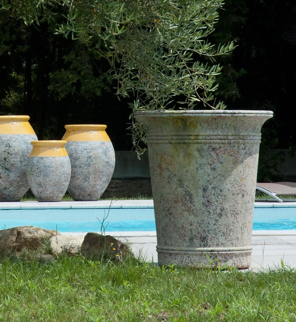 Gartengefäß Olive von French Pottery French Pottery ist eine Kollektion von Gefäßen, Vasen und Statuen für Garten und Terrasse. Gefäße wurden in der Vergangenheit zur Aufbewahrung von Wein, Olivenöl oder Oliven verwendet. In Anlehnung an diese Tradition werden unsere Gefäße in Handarbeit mit einer speziellen Seiltechnik hergestellt. Sie haben eine Olivenform, sind im oberen Bereich glasiert und erhalten von uns ein antikes Erscheinungsbild. Erhältlich sind sie in fünf Größen von 60 bis 130 cm. Terracotta Keramikgefäß die Herstellung dieser hochwertigen Produkte erfolgt in erstklassiger Qualität UV-, witterungs- und farbbeständig leicht zu reinigen Maße Ø int. 29 / Ø ext. 38 / Ø 45 × 60 cm Ø int. 31 / Ø ext. 41 / Ø 50 × 70 cm Ø int. 41 / Ø ext. 51 / Ø 72 × 90 cm Ø int. 44 / Ø ext. 56 / Ø 79 × 110 cm Ø int. 49 / Ø ext. 67 / Ø 96 × 130 cm
