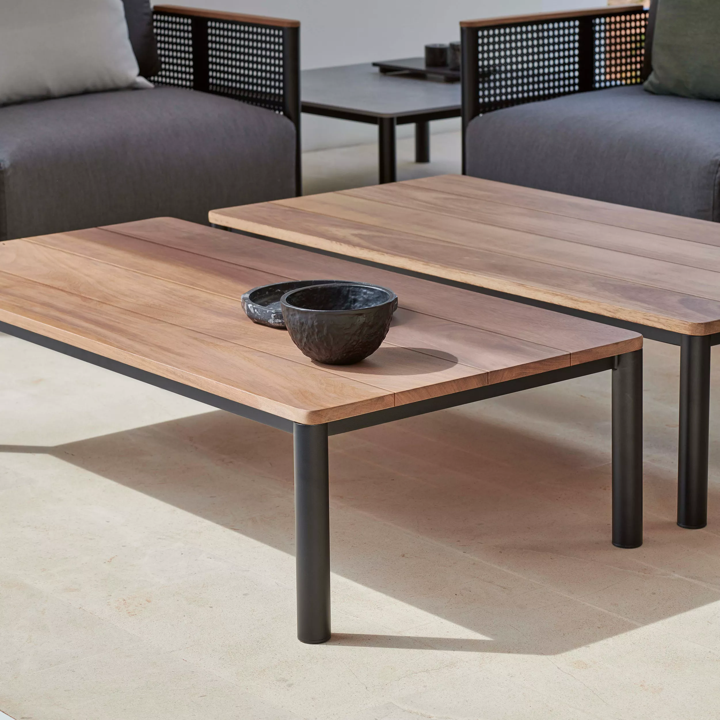 Hergestellt aus thermolackierten Aluminium, Iroko- oder Dekton®-Tischplatte.