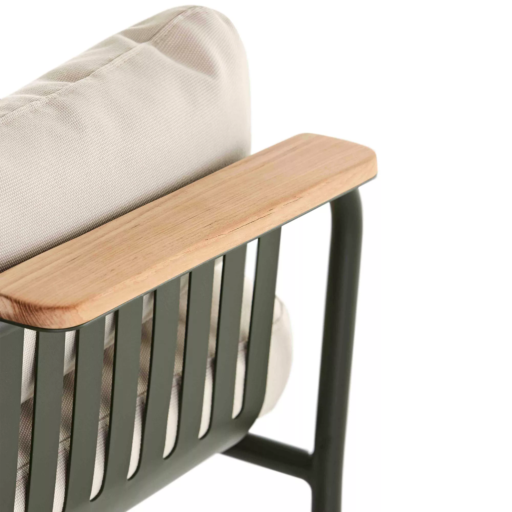 Hergestellt aus geschweißten thermolackierten Aluminiumprofilen, Iroko und Dekton®. Polyurethanschaum mit wasserabweisendem Stoff überzogen. Abziehbarer Bezug.