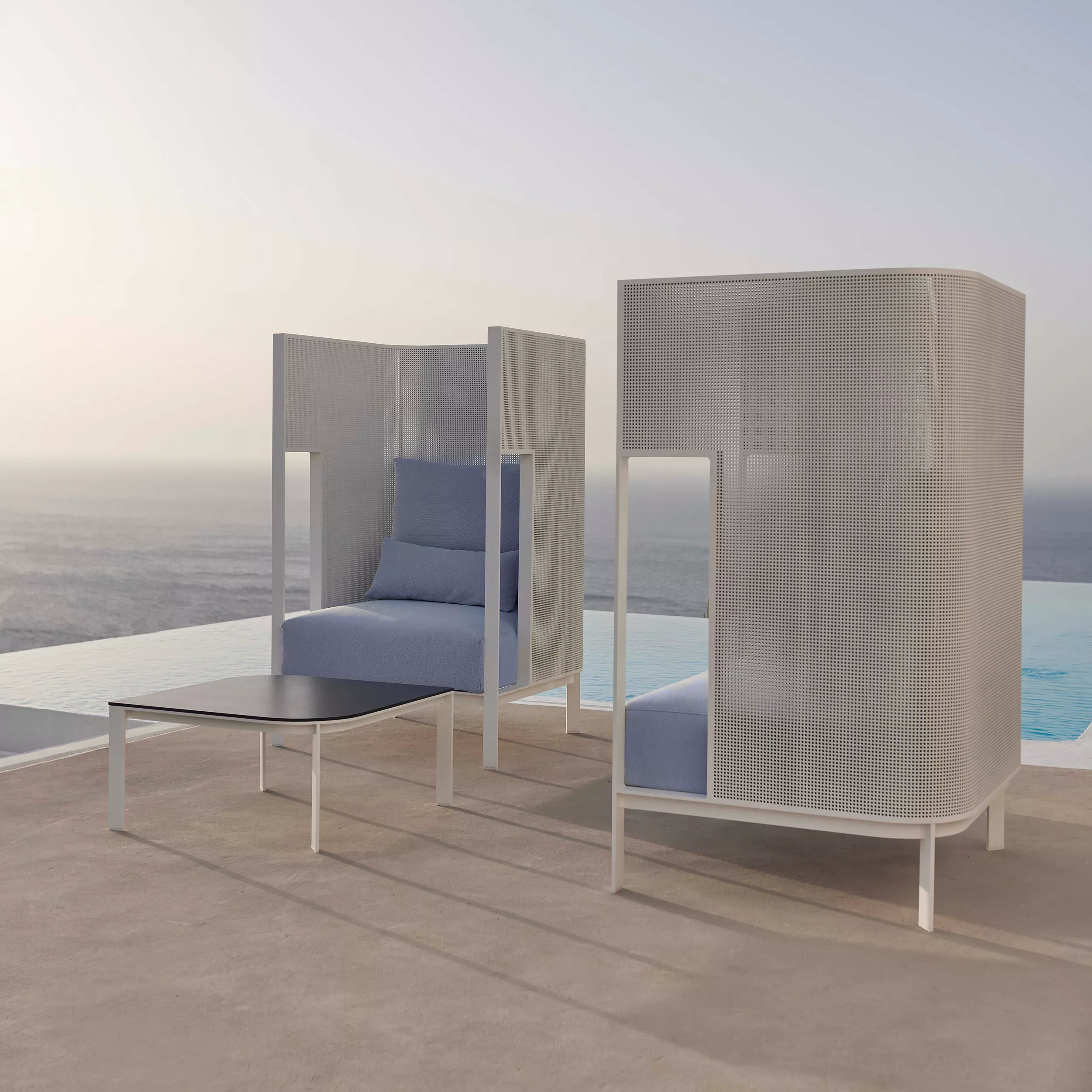 SOLANAS ist eine Outdoor-Möbelkollektion, die von Daniel Germani in Zusammenarbeit mit GANDIABLASCO und Dekton® by Cosentino designt wurde und innovative Produkte mit eigener Persönlichkeit umfasst. Sie kombiniert Strukturen aus extrudiertem Aluminium, dem Lieblingsmaterial von GANDIABLASCO, mit Dekton®, einem Material mit geringem Wartungsbedarf, das sich aus Rohmaterialien für Glas, Feinsteinzeug und Quarzit zusammensetzt und für die Flächen der Tische SOLANAS verwendet wird.
