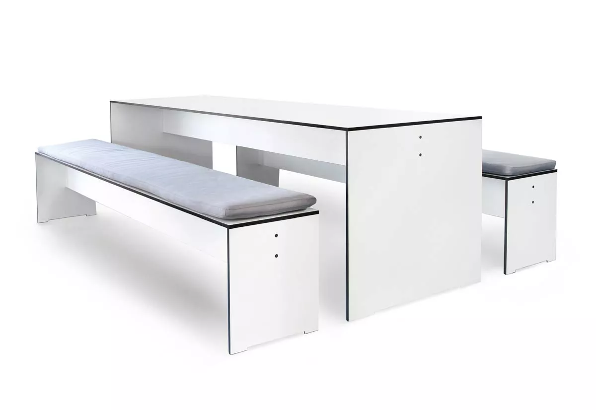 conmoto Riva Kids Gartentisch und 2 Bänke • 150 × 50 cm Gartentisch Riva Kids und 2 Bänke von conmoto mit einer hochwertigen HPL-Tischplatte conmoto Riva Kids Outdoor Kollektion, Designer: Marie Schmid-Schweiger, Florian Viererbl Die conmoto Riva Kids Lounge ist ein absolut puristisches Loungemöbel für den Innen- und Außenbereich. Aus den lieferbaren Maßen lassen sich individuelle Outdoor-Sofas und Sitzlandschaften bauen. Ein Tisch ergänzt die Lounge. Die lässigen Riva Kids Kissen und Auflagen geben höchsten Komfort und laden zum Entspannen ein. Mit einer eingenähten Unterlage liegen die Kissen rutschfest auf den Möbeln und müssen nicht gesondert befestigt werden. Riva Kids interpretiert das klassische Garten-Ensemble neu: geradlinig, hell und über jedes Wetter erhaben. Purismus ist das prägende Stilelement von Riva Kids. Die klare, reduzierte Formensprache fügt sich in jede Architektur ein und steht doch für sich. Die umfangreiche Riva Kids Kollektion besteht aus wetterfestem HPL mit Edelstahl-Verschraubungen. Alle Modelle können Sie in weiß-, anthrazit- oder taupefarbenem HPL (High Pressure Laminate) bestellen, die Kanten sind dabei immer schwarz. Die Oberflächen sind besonders leicht zu reinigen, lichtbeständig und kratzfest. Sondermaße sind auf Anfrage möglich. Die Riva Kids Lounge lädt durch die gegebene Modularität zum individuellen Zusammenstellen ein. Wählen Sie dabei zunächst eine der vielen Kombinationen aus, und bestimmen Sie die Grundform mit und ohne Seitenteil oder Rückenlehne. Auch bei der Farbe des Werkstoffs HPL dürfen Sie sich ganz bewusst für eine entscheiden – ob Weiß, Anthrazit, Taupe oder ein besonderes Petrol, was passt zu Ihnen? Gestell: HPL, schwarze Kante Tischplatte: HPL, schwarze Kante Maße (B × T× H) 150 × 50 × 52 cm Tischhöhe: 52 cm