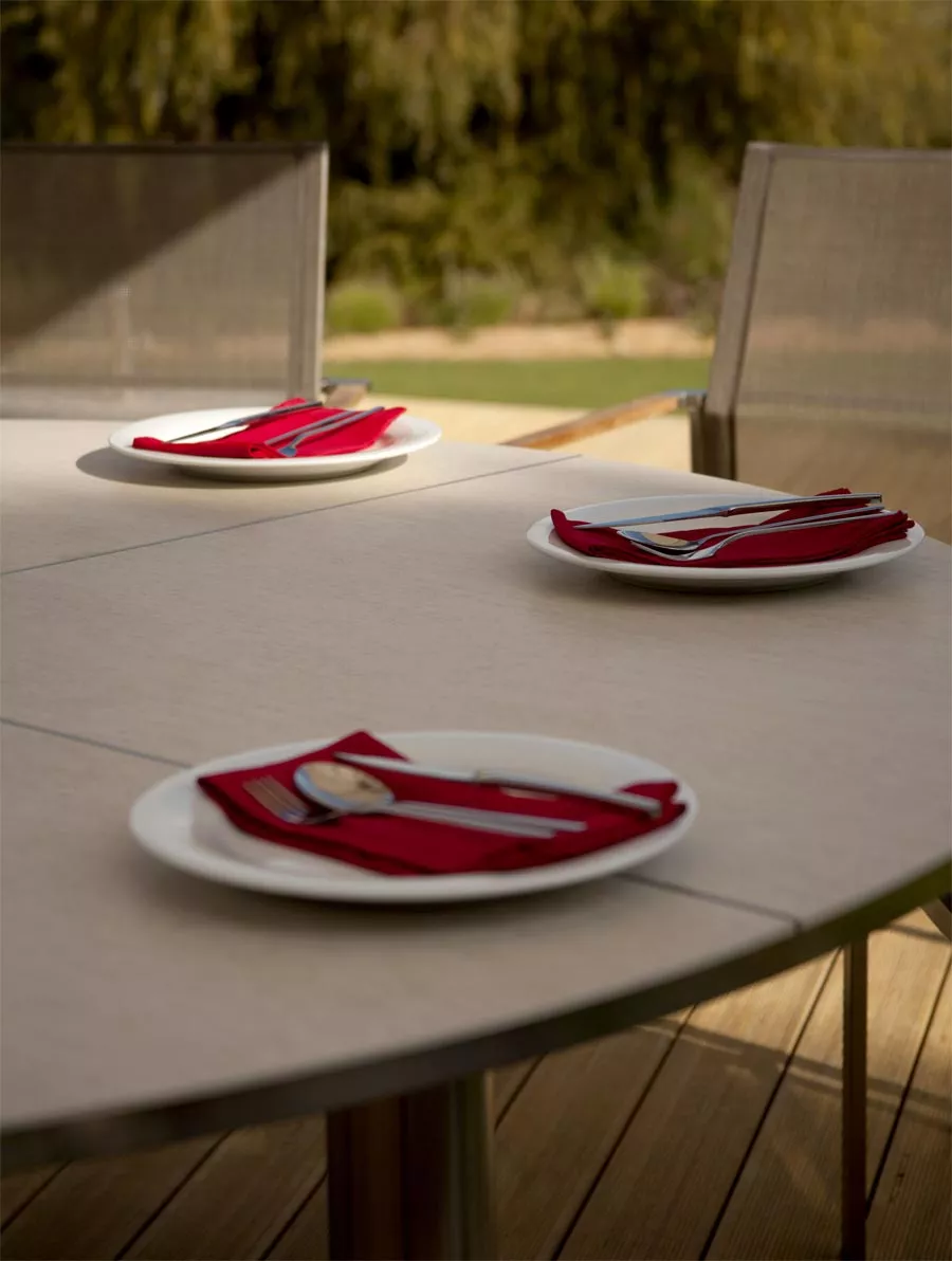 Barlow Tyrie Around Dining Esstisch Die Around Dining Kollektion von Barlow Tyrie verbindet raffinierte Formgebung mit erstklassigen Materialien und exzellentem Sitzkomfort. Entworfen von den Designern Nathalie de Leval und Andrew Jones, wurde diese Kollektion von klassischen Spindel- und dampfgebogenen Holzmöbeln inspiriert. Das Ergebnis: eine harmonische Verbindung aus klaren Linien, sanften Formen und luxuriösen Materialien, die jede Outdoor-Dining-Situation stilvoll ergänzt. Zwei Ausführungen: Arctic White mit Teakplatte – für eine helle Optik Forge Grey mit Teakplatte – für einen modernen, tiefen Farbton Witterungsbeständige Materialien für langanhaltende Schönheit im Freien Pflegeleicht Verfügbare Maße (B x T x H):154 x 98 x 74 cm215 x 98 x 74 cm
