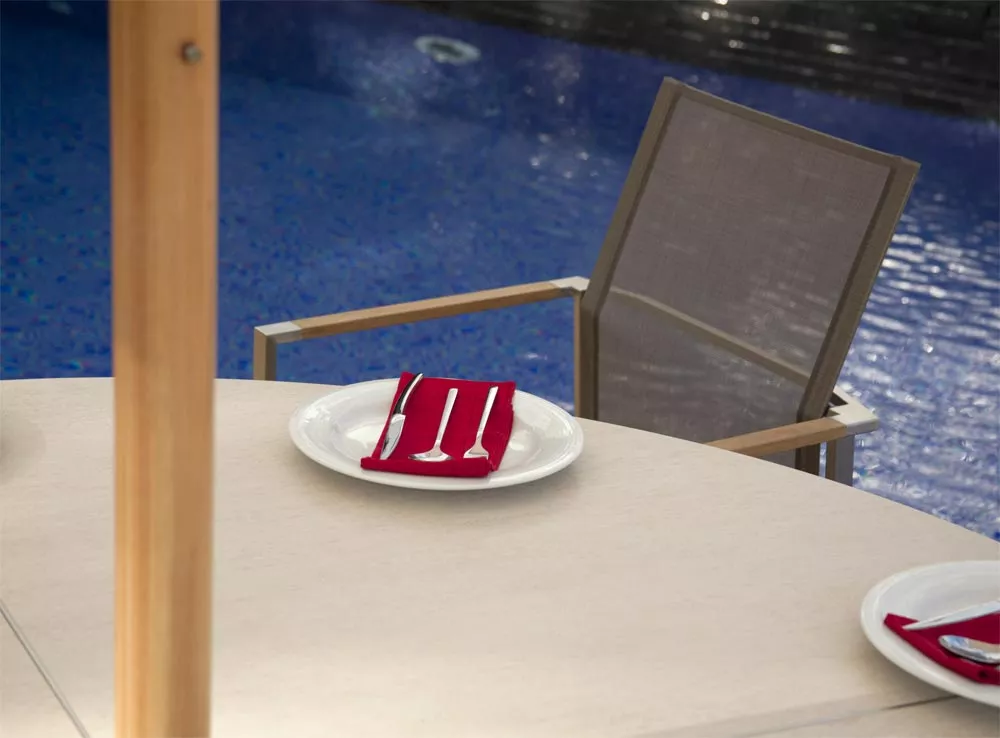 Gartentisch • Esstisch Equinox mit Keramikplatte und Gestell aus Edelstahl pulverbeschichtet.Barlow Tyrie runder Bistrotisch ist aus Edelstahl 316 Marine Grade hergestellt und mit Keramikplatten in 2 attraktiven Farben: Frost oder Dusk lieferbar.