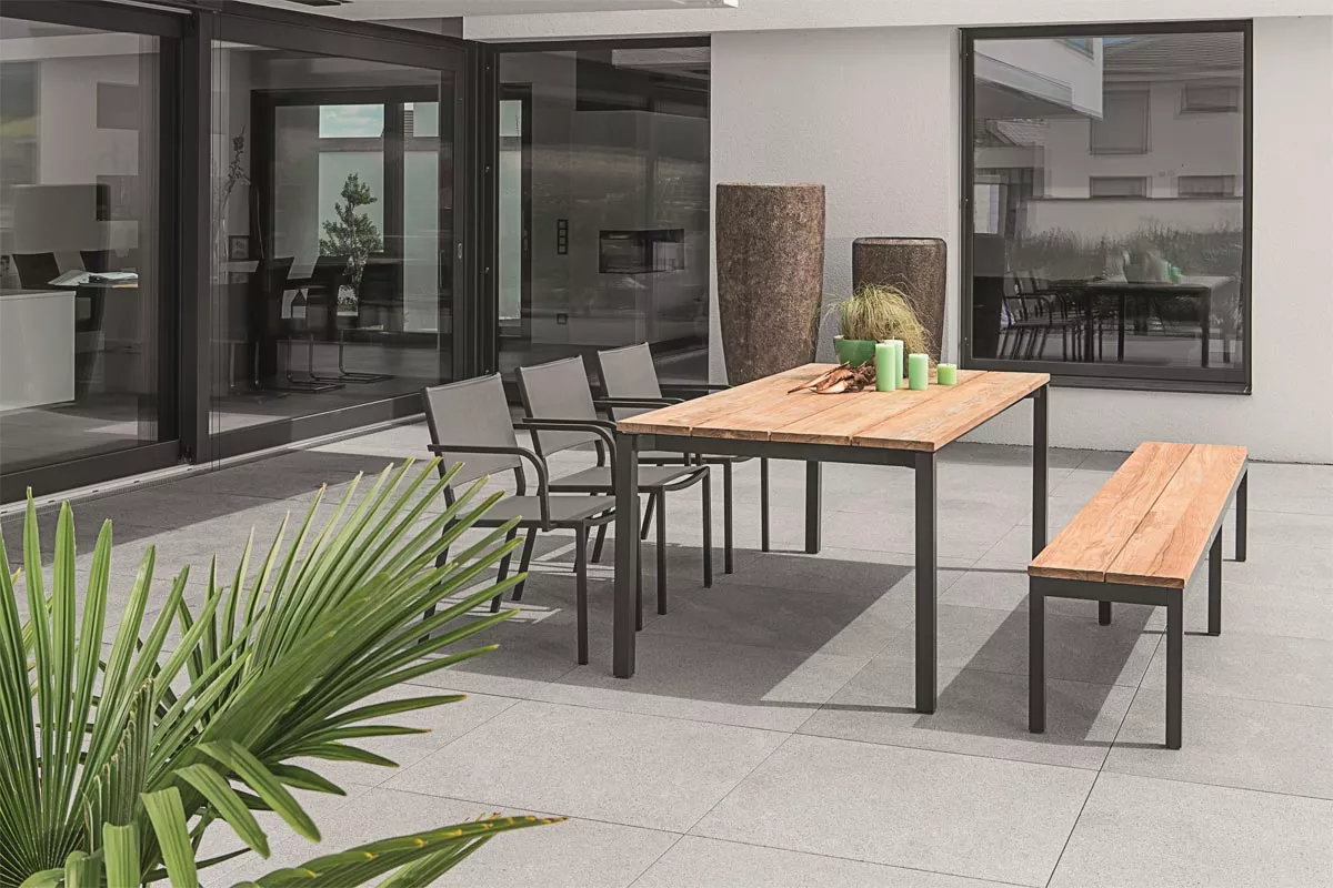 Gartentisch Rio von Fischer Möbel mit einem hochwertigen Gestell aus Aluminium, metallic-silber pulverbeschichtet oder mit Strukturlack anthrazit matt • Tischbeine quadratisch Das robuste Aluminiumgestell der Rio Tische in anthrazit oder metallic-silber ist eine perfekte Verbindung zu allen Stühlen aus dem gleichen Material. Die stabilen Tischbeine (50x50mm) in Verbindung mit dem solide verschweißten Rahmen tragen auf elegante Weise die unterschiedlichen Tischplatten. Oberflächen aus fm-laminat spezial, fm-ceramtop oder Teak ermöglichen eine perfekte Kombination zu den Rio Sesseln, aber auch zu vielen anderen Sesseln unseres Sortiments. Schraubgleiter ermöglichen einen Höhenausgleich bei Bodenunebenheiten. Rio Outdoor Esstisch mit eingerückter Zarge Rio lädt zum Entspannen ein. Ein klassischer Freischwinger der höchsten Ansprüchen gerecht wird, in Formgebung, Material und Sitzkomfort. Hergestellt wird Rio aus hochwertigem Aluminium und Outdoor Gewebe, Teak oder dem dauerelsastischen fm-rope. Die Armlehnen sind aus Teak oder in soft-touch Ausführung. Die passenden Tische werden in verschiedenen Größen angeboten. Als Tischplätte stehen verschiedene hochwertige Materialien zur Auswahl: Teak, fm-laminat oder fm-ceramtop. Fm-ceramtop Tischplatten bestehen aus einer äußerst harten 2-schichtigen Porzellankeramik, die absolut kratzfest, witterungsbeständig und pflegeleicht ist. Das Material ist zudem frostsicher und sehr leicht. Fm-laminat eignet sich hervorragend für den Außenbereich. Die Platten bestehen aus einer Verbindung von Zellulose und Harzen, die mit einem Spezialwitterungsschutz verbunden sind - besonders licht- und witterungsbeständig. Aluminiumgestell • metallic-silber pulverbeschichtet oder mit Strukturlack anthrazit matt Tischplatte • Teak oder fm-ceramtop Leicht zu reinigen Ganzjährig wetterfest Maße (B × T × H) 200 × 95 × 75 cm Tischhöhe inkl. Tischplatte in cm (Toleranzbereich +/- 2mm) fm-ceramtop 73,5 fm-ceramtop Zement grigio/nero 74,1 Teakholz-Leistenplatte 75,2 Premium/Vintage Teak 75,5