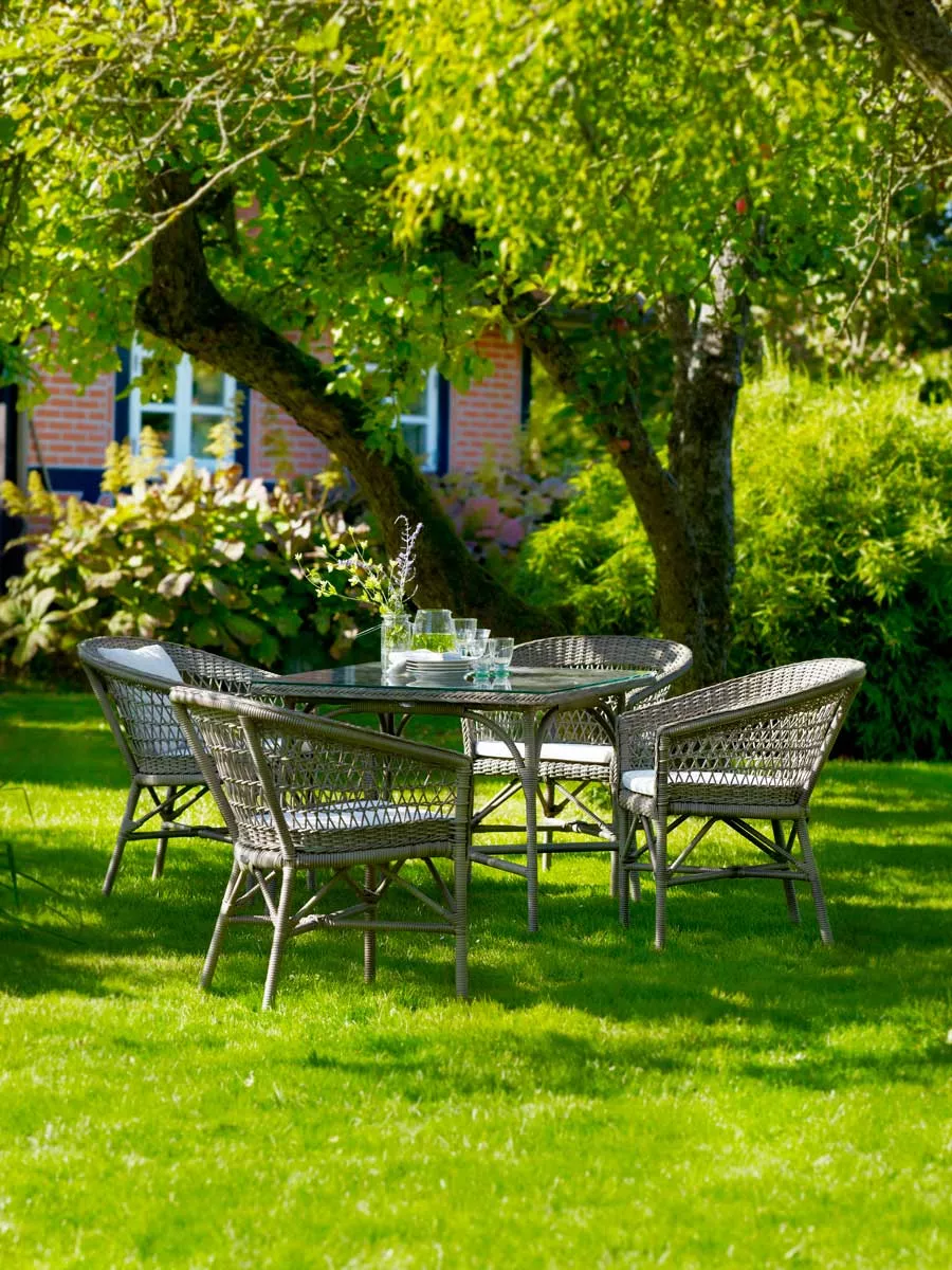 Georgia Garden Grace Esstisch Esstisch aus Aluminium mit einem handgeflochtenen Polyrattan Gestell Esstisch Grace von Sika Design hat einen platzsparenden Kreuzfuß, keine Ecken und keine Tischbeine. Wenn Ihre Gartenmöbel von Wärme und Romantik geprägt sind, werden Grace Tische zu einer schönen Ergänzung, sowohl im Innen- als auch im Außenbereich. Die Tische sind in der Farbe Antik braun oder Vintage white erhältlich. Eine Sicherheitsglasplatte für den Gartentisch ist leferbar. Das Polyrattan Geflecht der Grace Kollektion besteht aus einem Kunststoff, dass absolut resistent gegen Witterungseinflüsse ist und im Laufe der Zeit farbbestängig bleibt. Es ist handgflochten und hat eine Oberfläche, die sich ganz gut anfühlt und sehr natürlich aussieht. Aluminiumgestell Polyrattan Geflecht in der Farbe Antique Braun oder Vintage white, handgeflochten die Herstellung dieser hochwertigen Möbel erfolgt in erstklassiger Qualität UV-, witterungs- und farbbeständig leicht zu reinigen Maße: (Ø × H) 120 × 72 cm Sika Design Georgia Garden Katalog