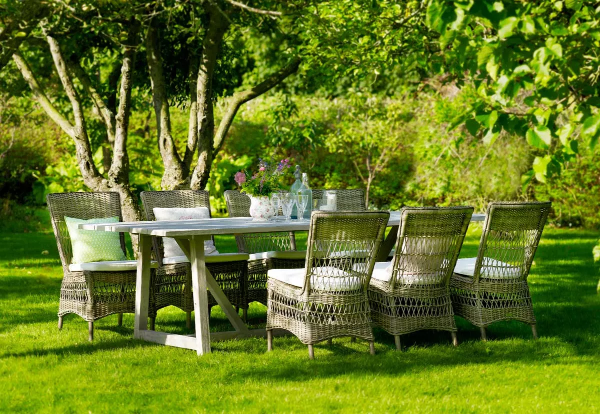 Georgia Garden Grace Esstisch Esstisch aus Aluminium mit einem handgeflochtenen Polyrattan Gestell Esstisch Grace von Sika Design hat einen platzsparenden Kreuzfuß, keine Ecken und keine Tischbeine. Wenn Ihre Gartenmöbel von Wärme und Romantik geprägt sind, werden Grace Tische zu einer schönen Ergänzung, sowohl im Innen- als auch im Außenbereich. Die Tische sind in der Farbe Antik braun oder Vintage white erhältlich. Eine Sicherheitsglasplatte für den Gartentisch ist leferbar. Das Polyrattan Geflecht der Grace Kollektion besteht aus einem Kunststoff, dass absolut resistent gegen Witterungseinflüsse ist und im Laufe der Zeit farbbestängig bleibt. Es ist handgflochten und hat eine Oberfläche, die sich ganz gut anfühlt und sehr natürlich aussieht. Aluminiumgestell Polyrattan Geflecht in der Farbe Antique Braun oder Vintage white, handgeflochten die Herstellung dieser hochwertigen Möbel erfolgt in erstklassiger Qualität UV-, witterungs- und farbbeständig leicht zu reinigen Maße: (Ø × H) 120 × 72 cm Sika Design Georgia Garden Katalog