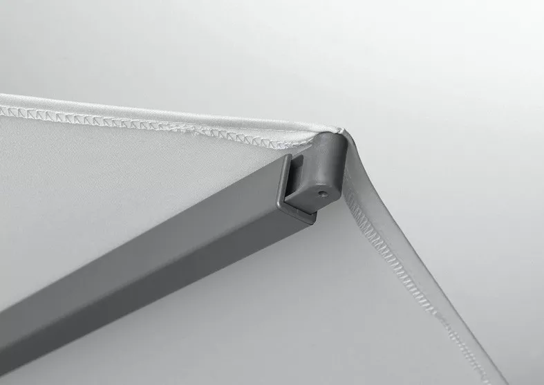 Material und Technik: Das Gestell ist aus Aluminium mit profiliertem Mast, Kurbelantrieb und Drehmechanismus für stufenlose Schrägstellung. Schirmbezug ist auswechselbar und selbstspannend, dank den flexiblen Strebenenden.