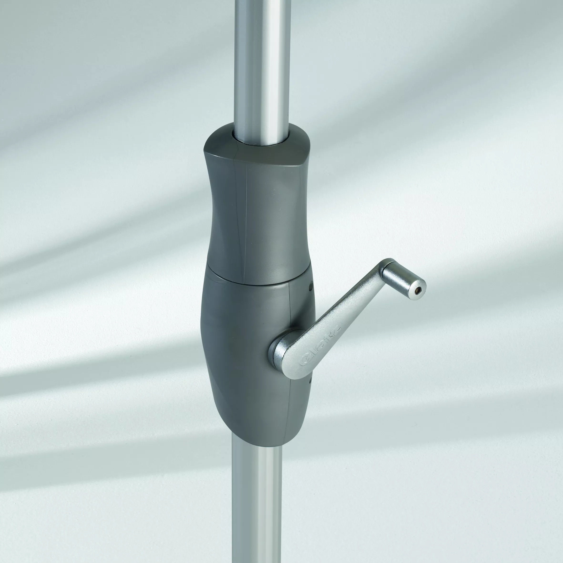 Richtig Spaß macht auch die Bedienung. Eine Kurbel öffnet und schließt Alu-Twist. Drehen Sie das Oberteil des Kurbelgehäuses, bringen Sie das Schirmdach stufenlos in die gewünschte Neigung. Und das alles, während Sie bequem sitzen bleiben.