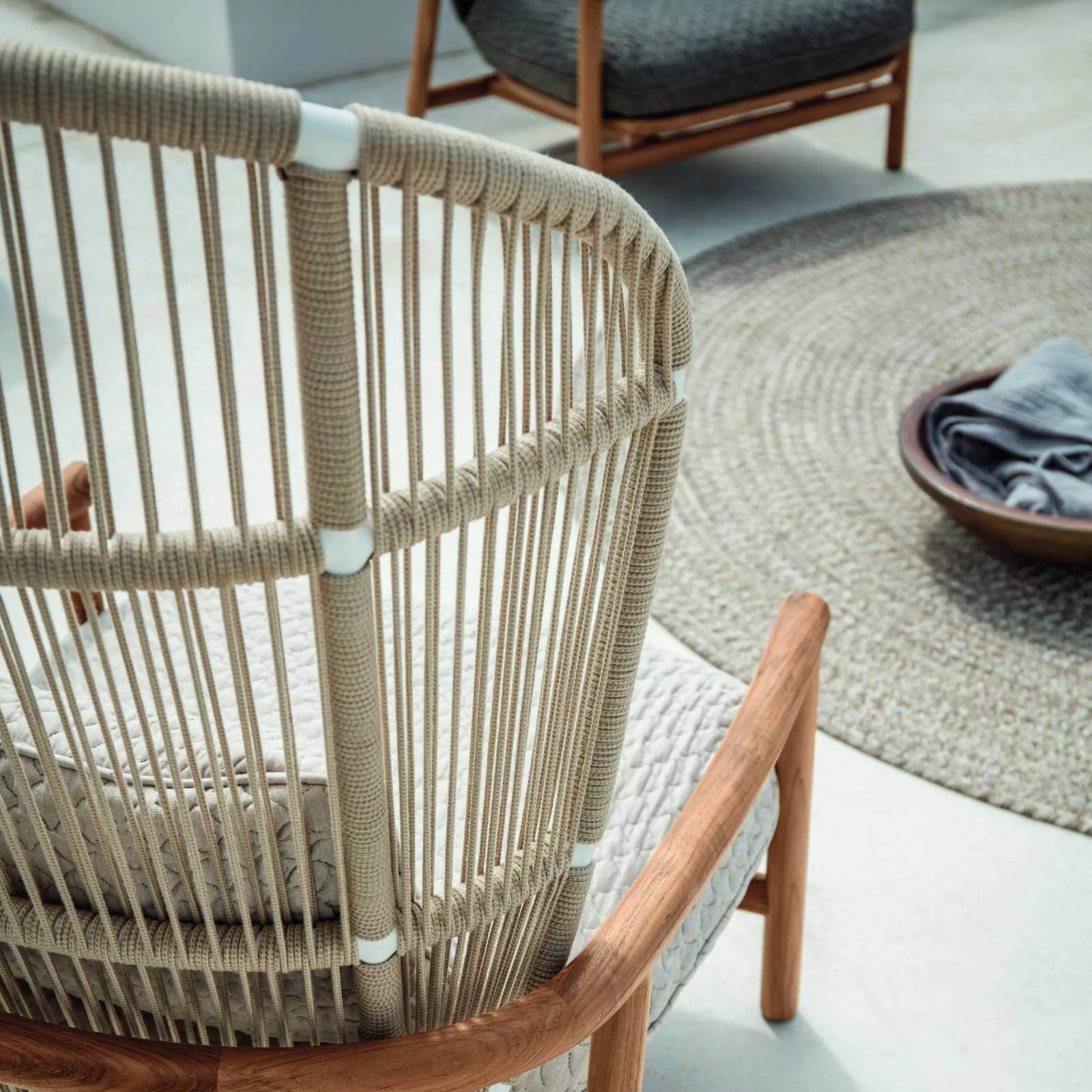 Gestell: Teakholz mit Rückenlehne aus pulverbeschichtetem Aluminium und Seil