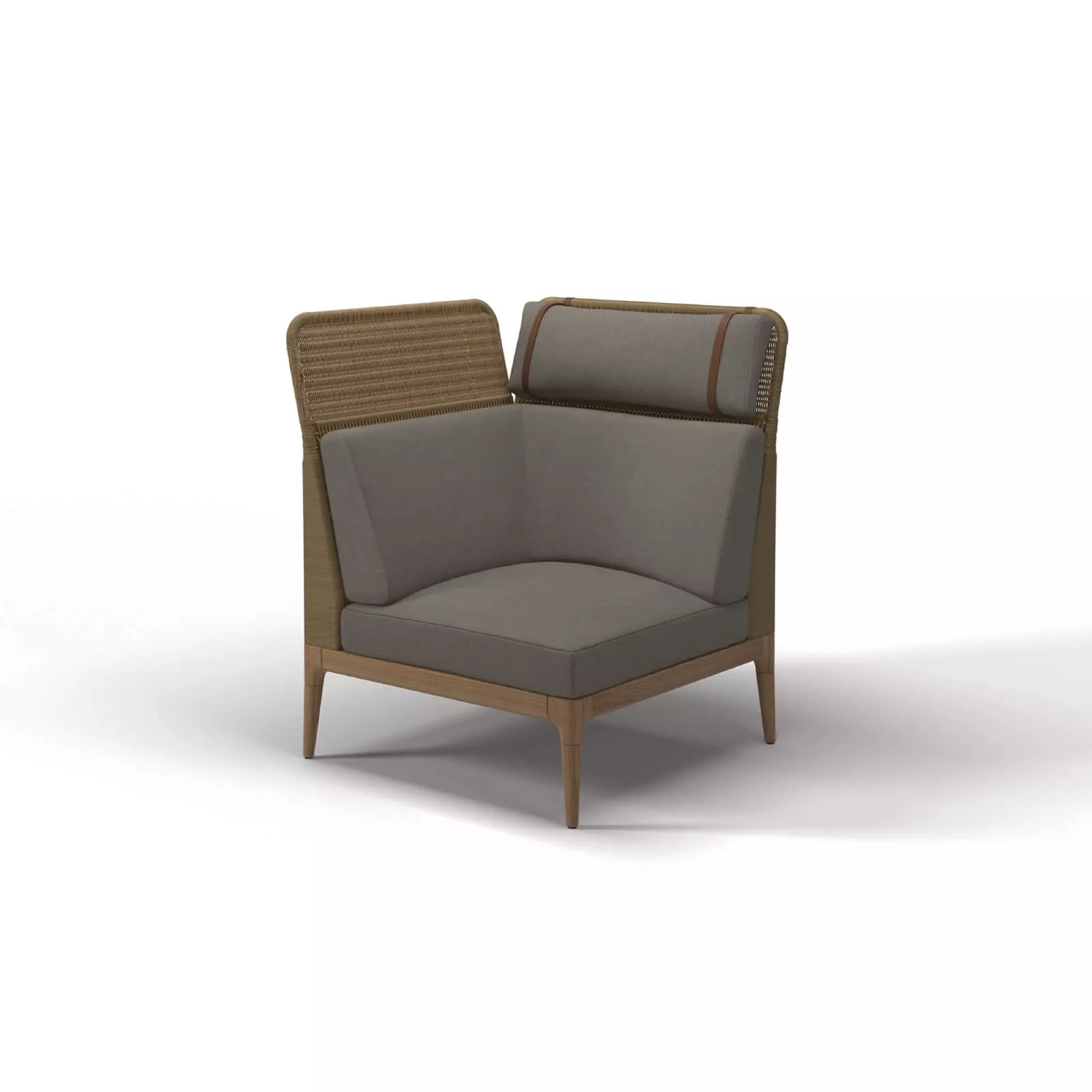 Gloster Lima Eckmodul | L+R Die Essenz natürlicher und taktiler Materialien wird in der neuen Lima-Modul-Sitzkollektion von Henrik Pedersen zu einem definierten Element vereint. Dank der einfachen Flexibilität der modularen Elemente von Lima können Sie Ihre Sitzecke genau so zusammenstellen, wie Sie möchten. Eine großzügige, gesellige Sitzgarnitur, eine intimere Chaiselongue-Ecke oder ein einzelnes Sofa - mit Lima ist die einzige Einschränkung Ihre Vorstellungskraft. Die Gestelle der Gloster Lima Gartenmöbel bestehen aus edelstem Teakholz. Dessen fachkundiger Oberflächenbehandlung ist es zu verdanken, dass das kostbare Holz einen bestechend schönen Glanz aufweist. Für Gloster ist es übrigens selbstverständlich, dass jeder verarbeitete Teak-Baum auch selbst angepflanzt wurde. Somit ist sichergestellt, dass es sich bei dem verbauten Holz um Plantagen-Teak und nicht um illegal geschlagenes Holz handelt. Das Geflecht der Lima Kollektion besteht aus wetterbeständiger Kunststoff-Faser in der Farbe "Wheat". Die zum Sessel gehörigen Polster können Sie bei den individuellen Optionen nach Lust und Laune passend zu Ihren Vorlieben und Bedürfnissen auswählen - die Auswahl ist riesig!Gestell: Teakholz / bespannt mit Kunststoffgeflecht. Das Geflecht ist dem natürlichen Look von Rattan nachempfunden und hat eine aufgeraute Oberfläche. Polster: Outdoor Ausführung Maße (B × T × H):83 × 83 × 86 cm Sitzhöhe: 38 cm