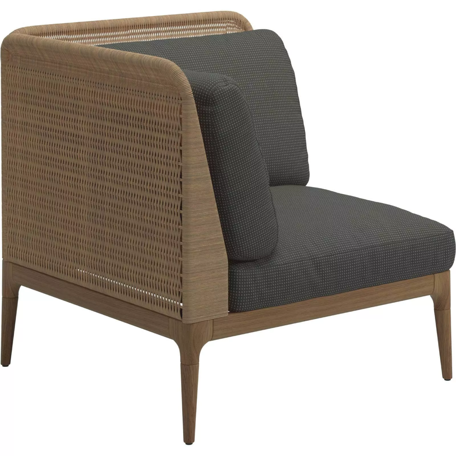 Gloster Lima Eckmodul Hochlehner | L+R Die Essenz natürlicher und taktiler Materialien wird in der neuen Lima-Modul-Sitzkollektion von Henrik Pedersen zu einem definierten Element vereint. Dank der einfachen Flexibilität der modularen Elemente von Lima können Sie Ihre Sitzecke genau so zusammenstellen, wie Sie möchten. Eine großzügige, gesellige Sitzgarnitur, eine intimere Chaiselongue-Ecke oder ein einzelnes Sofa - mit Lima ist die einzige Einschränkung Ihre Vorstellungskraft. Die Gestelle der Gloster Lima Gartenmöbel bestehen aus edelstem Teakholz. Dessen fachkundiger Oberflächenbehandlung ist es zu verdanken, dass das kostbare Holz einen bestechend schönen Glanz aufweist. Für Gloster ist es übrigens selbstverständlich, dass jeder verarbeitete Teak-Baum auch selbst angepflanzt wurde. Somit ist sichergestellt, dass es sich bei dem verbauten Holz um Plantagen-Teak und nicht um illegal geschlagenes Holz handelt. Das Geflecht der Lima Kollektion besteht aus wetterbeständiger Kunststoff-Faser in der Farbe "Wheat". Die zum Sessel gehörigen Polster können Sie bei den individuellen Optionen nach Lust und Laune passend zu Ihren Vorlieben und Bedürfnissen auswählen - die Auswahl ist riesig!Gestell: Teakholz / bespannt mit Kunststoffgeflecht Das Geflecht ist dem natürlichen Look von Rattan nachempfunden und hat eine aufgeraute Oberfläche. Polster: Outdoor Ausführung Maße (B × T × H):88 × 88 × 108 cm Sitzhöhe: 38 cm