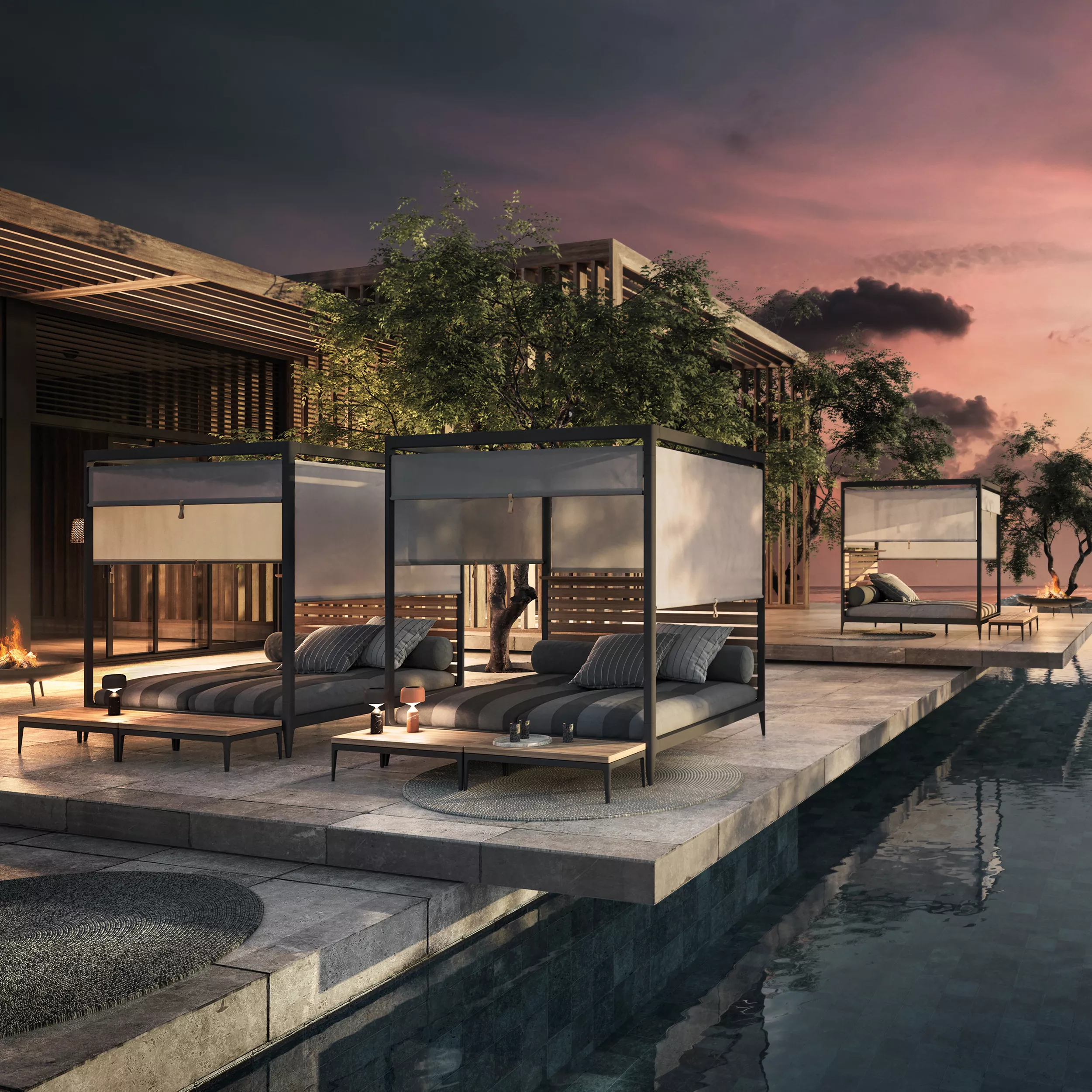 Der perfekte Rückzugsort für Ihren Außenbereich: Die neue Lodge Cabana von Gloster bietet alles um es sich so richtig gemütlich zu machen. Hier kann man von den ersten Sonnenstrahlen am Morgen bis zum Sonnenuntergang die langen Sommertage verbringen. Exklusive Sunbrella-Bezüge, die Teak-Rückwand und die Sonnenschutzrollos machen aus der Liege einen idealen und sehr persönlichen Rückzugsort.