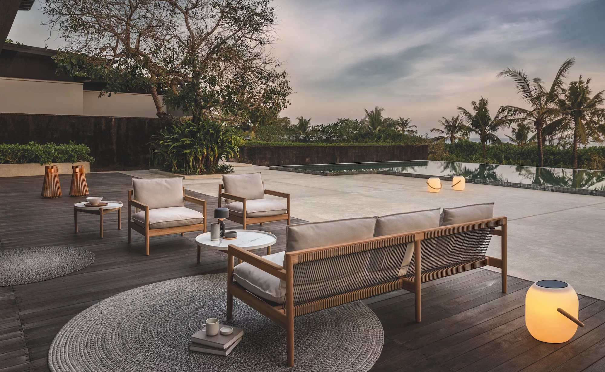 Die Sitzmöbelkollektion Saranac weckt ein Gefühl nostalgischer Behaglichkeit und weckt wehmütige Erinnerungen an langsamere Zeiten und ein anderes Lebenstempo. Mit einem massiven Teakholzrahmen, der an den Einfluss der Jahrhundertmitte erinnert, und sehr bequemen Sitzkissen präsentiert Saranac ein einfaches Design, das einen komplexen Charakter mit subtilem Stil verbirgt. Dieser Meilenstein von Mark Gabbertas umfasst einen Lounge Chair, einen Ottoman, ein 2-Sitzer- und ein 3-Sitzer-Sofa.