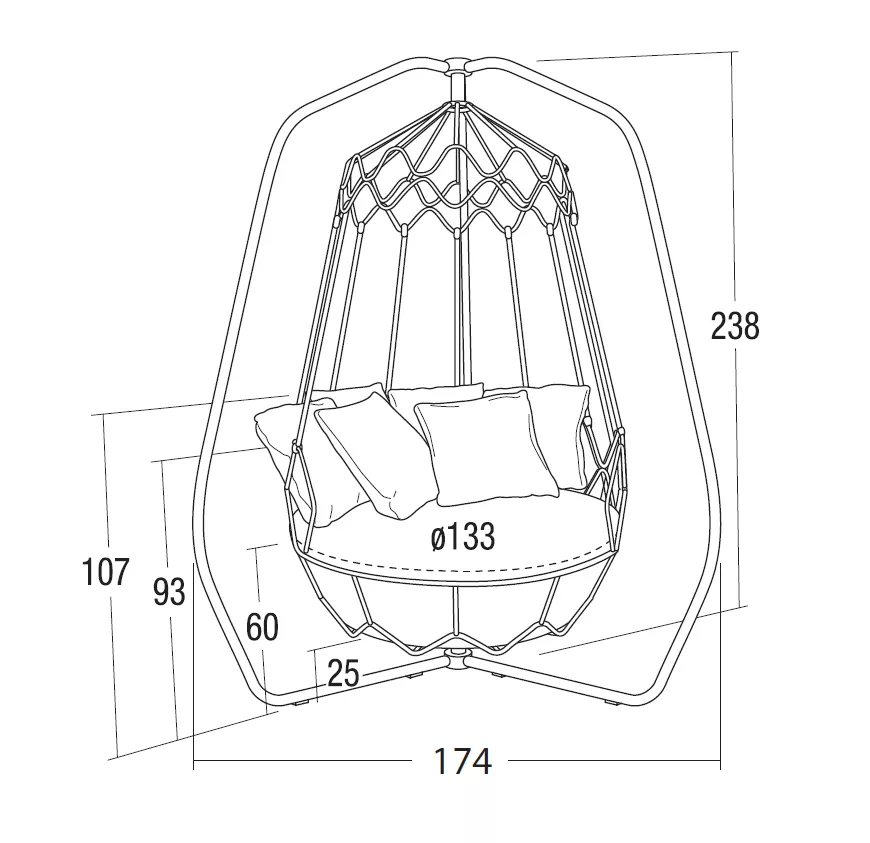 Roberti Gravity Outdoor Gartensofa Gravity Swing Sofa Ø 133 × 238 cm Hergestellt mit pulverbeschichtetem Edelstahlgestell. Perfekt geeignet für die Innen- und Außeneinrichtung von Wohn- und Objektprojekten Gravity ist ein gemütliches Outdoor Schaukelsofa mit bunten Kissen, verspielten Kombinationen von Farben und Designs, das perfekt als Terrassenmöbel und Gartenmöbel dient. Ohne Aufhängung Seile kann es sich auch in ein Luxussofa zur Entspannung verwandeln. Roberti ist ein hochwertiges und vielseitiges Vorschlagsensemble für die Einrichtung des Außenbereichs. Die Vielfalt der Kollektionen kann die fachliche Meisterschaft, das originelle Design und die perfekte Auswahl der Materialien bestens ausdrücken. Das Outdoor Leben wird somit eine freie, entspannende Lebenserfahrung, die man gern im Freundeskreis teilt. Elegantes Design der Gartenmöbel integriert sich harmonisch in Ihr Ambiente. Lassen Sie sich von Roberti Lifestyle inspirieren. Lounge Kollektion Gravity wird ausschließlich aus Edelstahl hergestellt, was in den leichten und fließenden Formen der Möbelstücke zum Ausdruck kommt. Die tragende Struktur besteht aus gebogenen Konstruktionen, während die Sitze geschwungene Formen aufweisen. Gravity ist eine subtile und elegante Outdoor-Möbelkollektion, die von architektonischem Charakter geprägt ist und zeitlose Schönheit und Harmonie ausstrahlt. Alle Teile der Kollektion integrieren sich optimal in jede Umgebung und trage dazu bei, dass wir das Leben im Freien mit Eleganz und Natürlichkeit genießen können, wo auch immer wir uns aufhalten. Die Roberti Lounge Kollektion Gravity ist aus jeder Perspektive ein Blickfang. Die stilsicheren Linien und elegante Lounge Atmosphäre passen perfekt in jeden Wohnraum und laden zur Gastlichkeit ein. Gestell: Edelstahl AISI 304 pulverbeschichtet Leicht zu reinigen Wetterfest Tragkraft 300 kg Maße: (Ø × SH/H) 133 × 60/238 cm