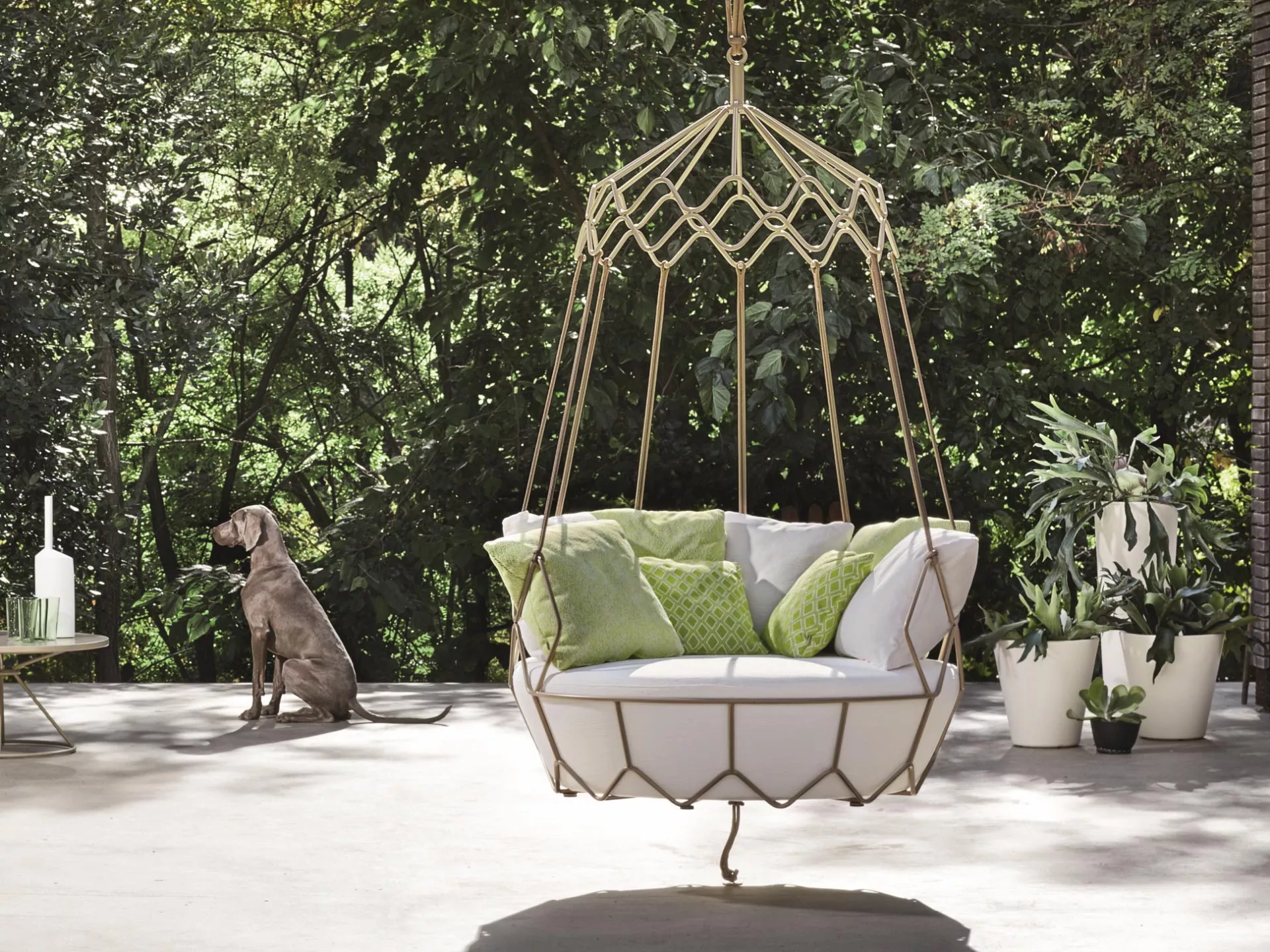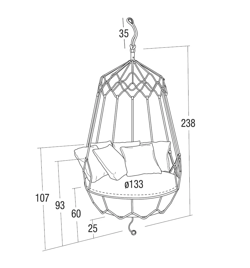 Roberti Gravity Outdoor Gartensofa mit Edelstahlgestell Gravity Swing Sofa 174 × 238 cm Hergestellt mit pulverbeschichtetem Edelstahlgestell. Perfekt geeignet für die Innen- und Außeneinrichtung von Wohn- und Objektprojekten Gravity ist ein gemütliches Outdoor Schaukelsofa mit bunten Kissen, verspielten Kombinationen von Farben und Designs, das perfekt als Terrassenmöbel und Gartenmöbel dient. Ohne Aufhängung Seile kann es sich auch in ein Luxussofa zur Entspannung verwandeln. Roberti ist ein hochwertiges und vielseitiges Vorschlagsensemble für die Einrichtung des Außenbereichs. Die Vielfalt der Kollektionen kann die fachliche Meisterschaft, das originelle Design und die perfekte Auswahl der Materialien bestens ausdrücken. Das Outdoor Leben wird somit eine freie, entspannende Lebenserfahrung, die man gern im Freundeskreis teilt. Elegantes Design der Gartenmöbel integriert sich harmonisch in Ihr Ambiente. Lassen Sie sich von Roberti Lifestyle inspirieren. Lounge Kollektion Gravity wird ausschließlich aus Edelstahl hergestellt, was in den leichten und fließenden Formen der Möbelstücke zum Ausdruck kommt. Die tragende Struktur besteht aus gebogenen Konstruktionen, während die Sitze geschwungene Formen aufweisen. Gravity ist eine subtile und elegante Outdoor-Möbelkollektion, die von architektonischem Charakter geprägt ist und zeitlose Schönheit und Harmonie ausstrahlt. Alle Teile der Kollektion integrieren sich optimal in jede Umgebung und trage dazu bei, dass wir das Leben im Freien mit Eleganz und Natürlichkeit genießen können, wo auch immer wir uns aufhalten. Die Roberti Lounge Kollektion Gravity ist aus jeder Perspektive ein Blickfang. Die stilsicheren Linien und elegante Lounge Atmosphäre passen perfekt in jeden Wohnraum und laden zur Gastlichkeit ein. Gestell: Edelstahl AISI 304 pulverbeschichtet Leicht zu reinigen Wetterfest Tragkraft 300 kg Maße: (B / Ø × SH / H) 174 / 133 × 60 / 238 cm